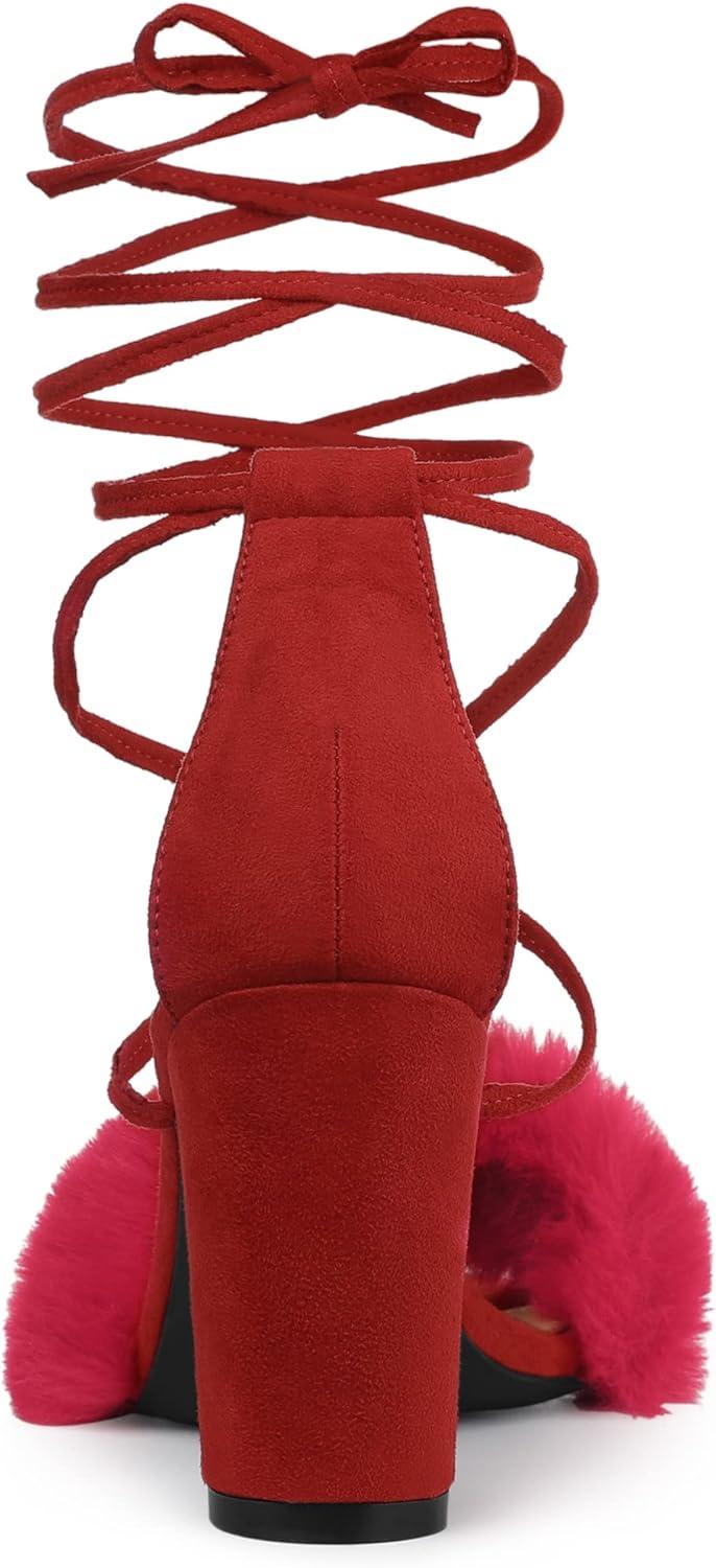 Allegra K Women's Faux Fur Lace Up Strappy Chunky Heels Sandals(Red)