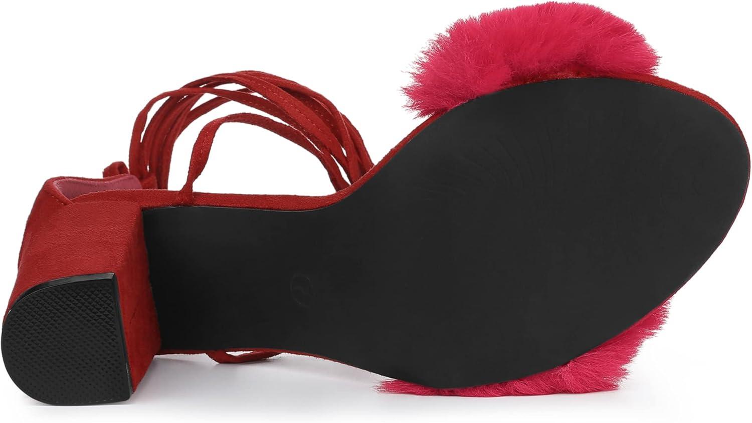 Allegra K Women’s Faux Fur Lace Up Strappy Chunky Heels Sandals(Red)
