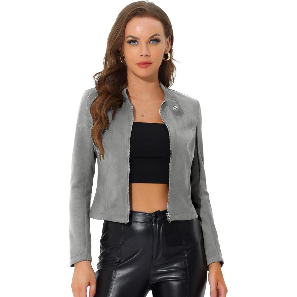 Allegra K Women’s Faux Suede Jacket Stand Collar Zip Up Long Sleeve Motorcycle Biker Coat(Gray)