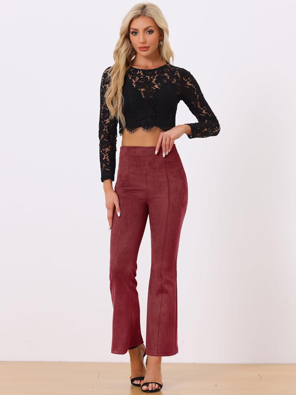 Allegra K Women’s Faux Suede Pants Business Casual Wide Legs Bell Bottom Flared Trousers(Burgundy)