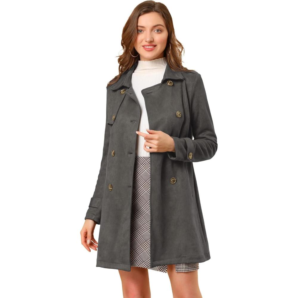 Allegra K Women's Faux Suede Trench Coat Notched Lapel Double Breasted Jacket with Belt(Dark Gray)