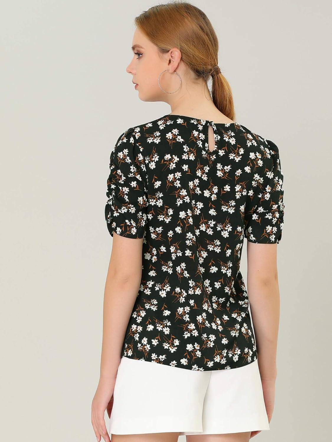 Allegra K Women's Floral Blouse Crew Neck Valentine's Day Casual Shirred Short Sleeve Top(Black)