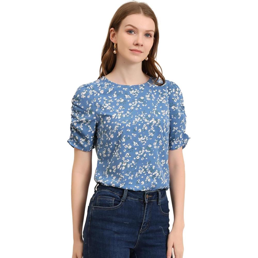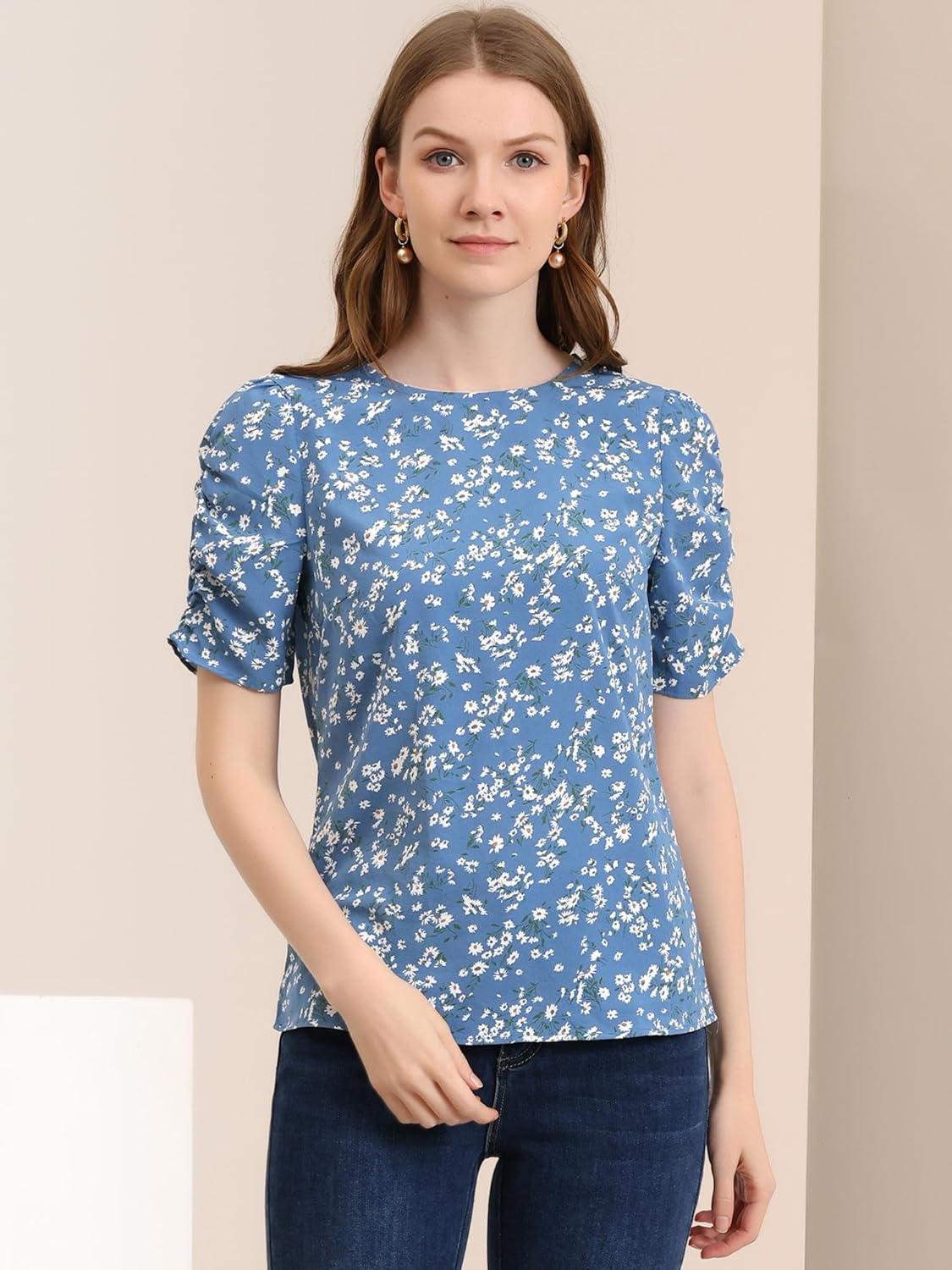 Allegra K Women’s Floral Blouse Crew Neck Valentine’s Day Casual Shirred Short Sleeve Top(Blue Floral)