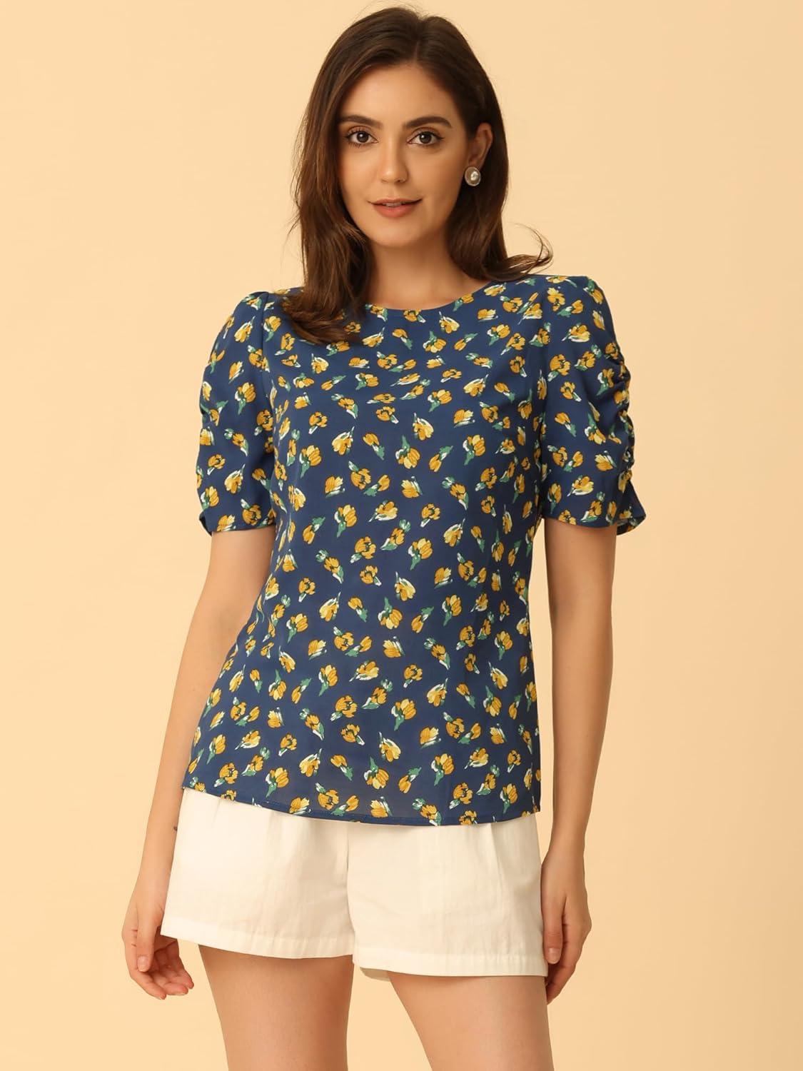 Allegra K Women's Floral Blouse Crew Neck Valentine's Day Casual Shirred Short Sleeve Top(Deep Blue)