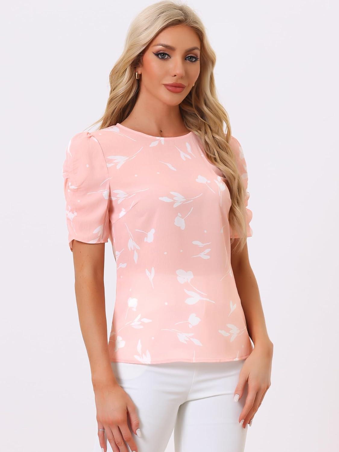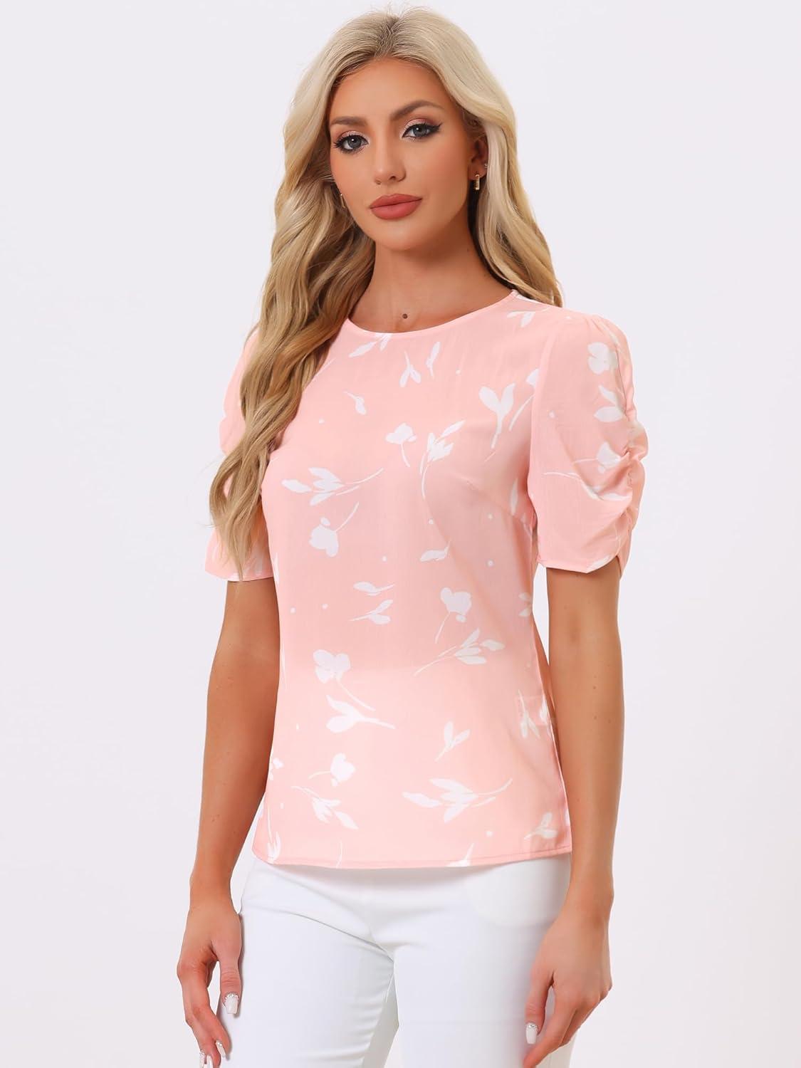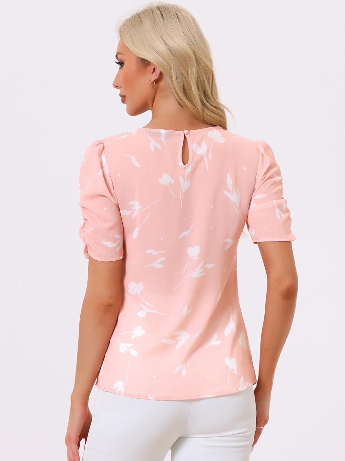 Allegra K Women’s Floral Blouse Crew Neck Valentine’s Day Casual Shirred Short Sleeve Top(Pink Floral)