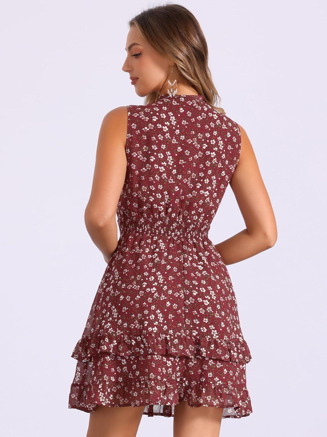 imageAllegra K Womens Floral Chiffon Dresses Smocked Mini Sleeveless ALine DressBurgundy