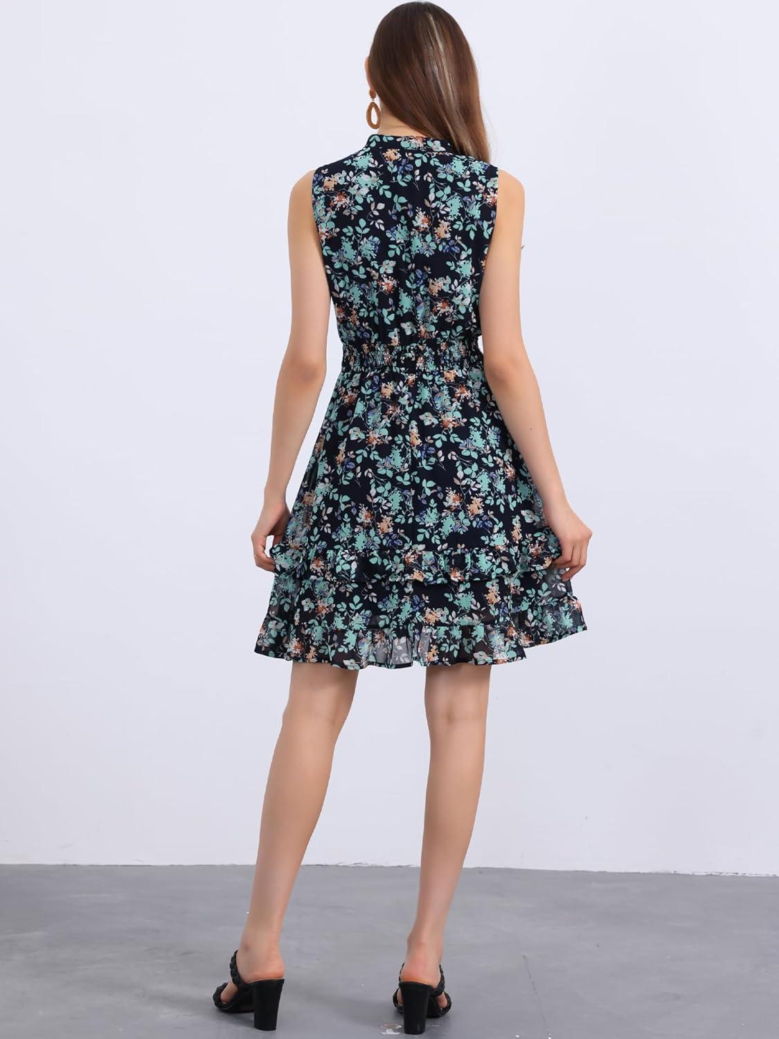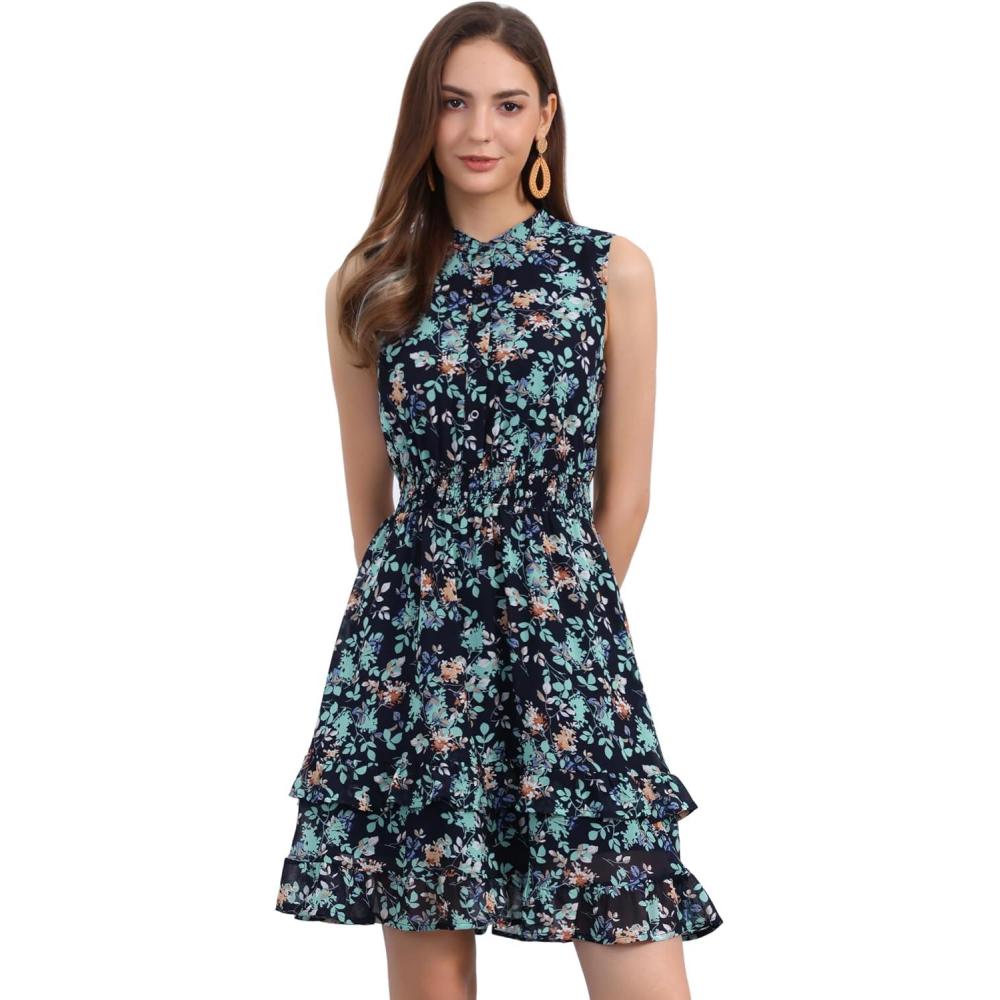 Allegra K Women’s Floral Chiffon Dresses Smocked Mini Sleeveless A-Line Dress(Dark Blue)
