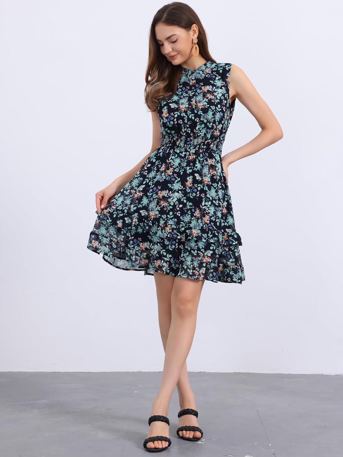 imageAllegra K Womens Floral Chiffon Dresses Smocked Mini Sleeveless ALine DressGreen