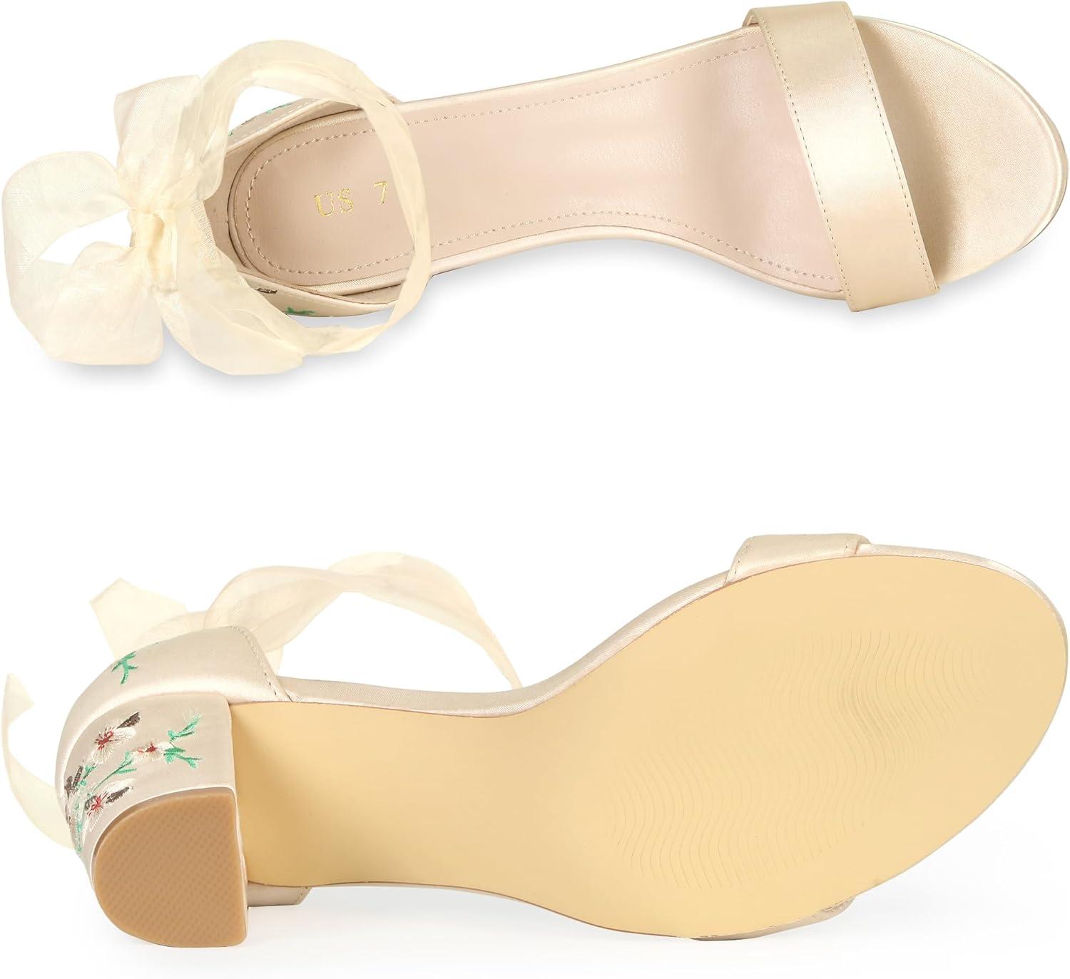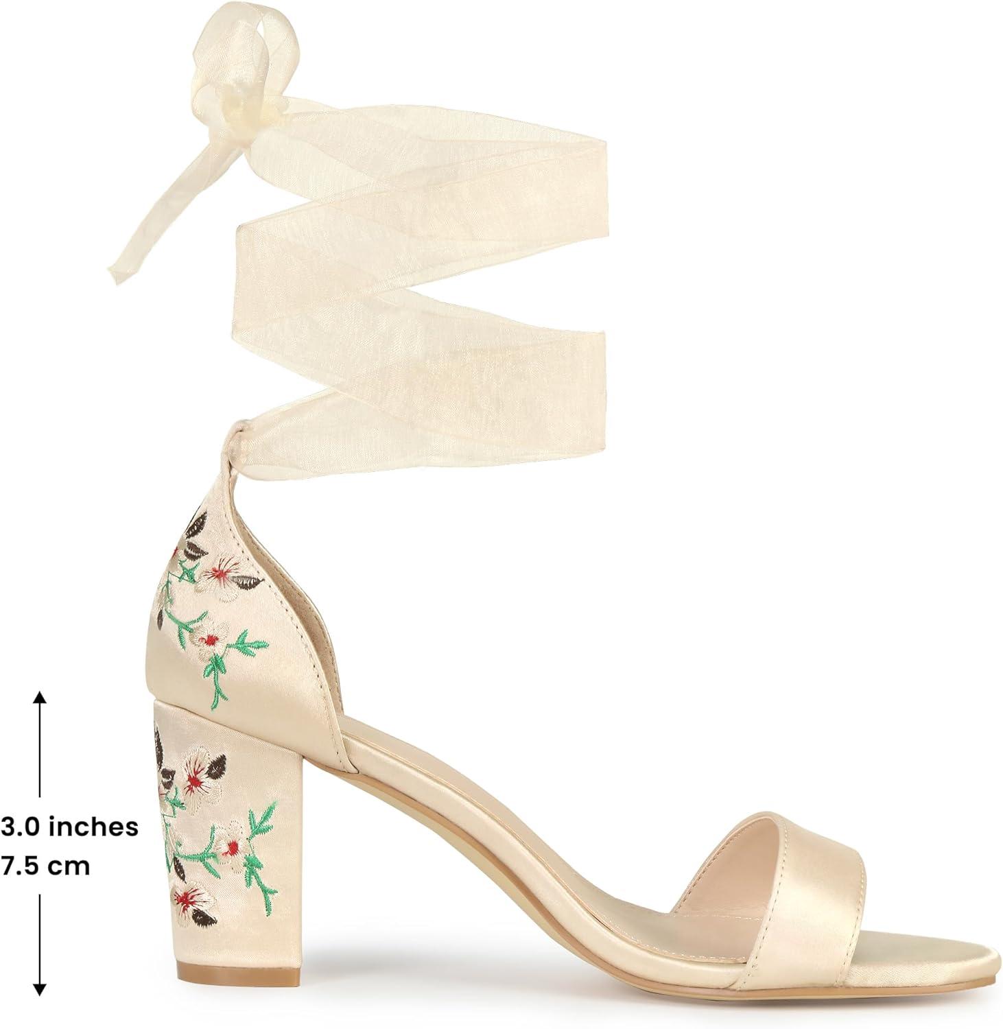 Allegra K Women’s Floral Heels Satin Lace Up Chunky Heel Sandals(Champagne)
