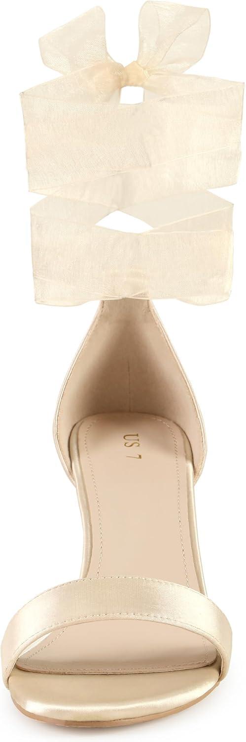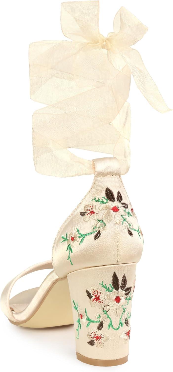Allegra K Women's Floral Heels Satin Lace Up Chunky Heel Sandals(Champagne)