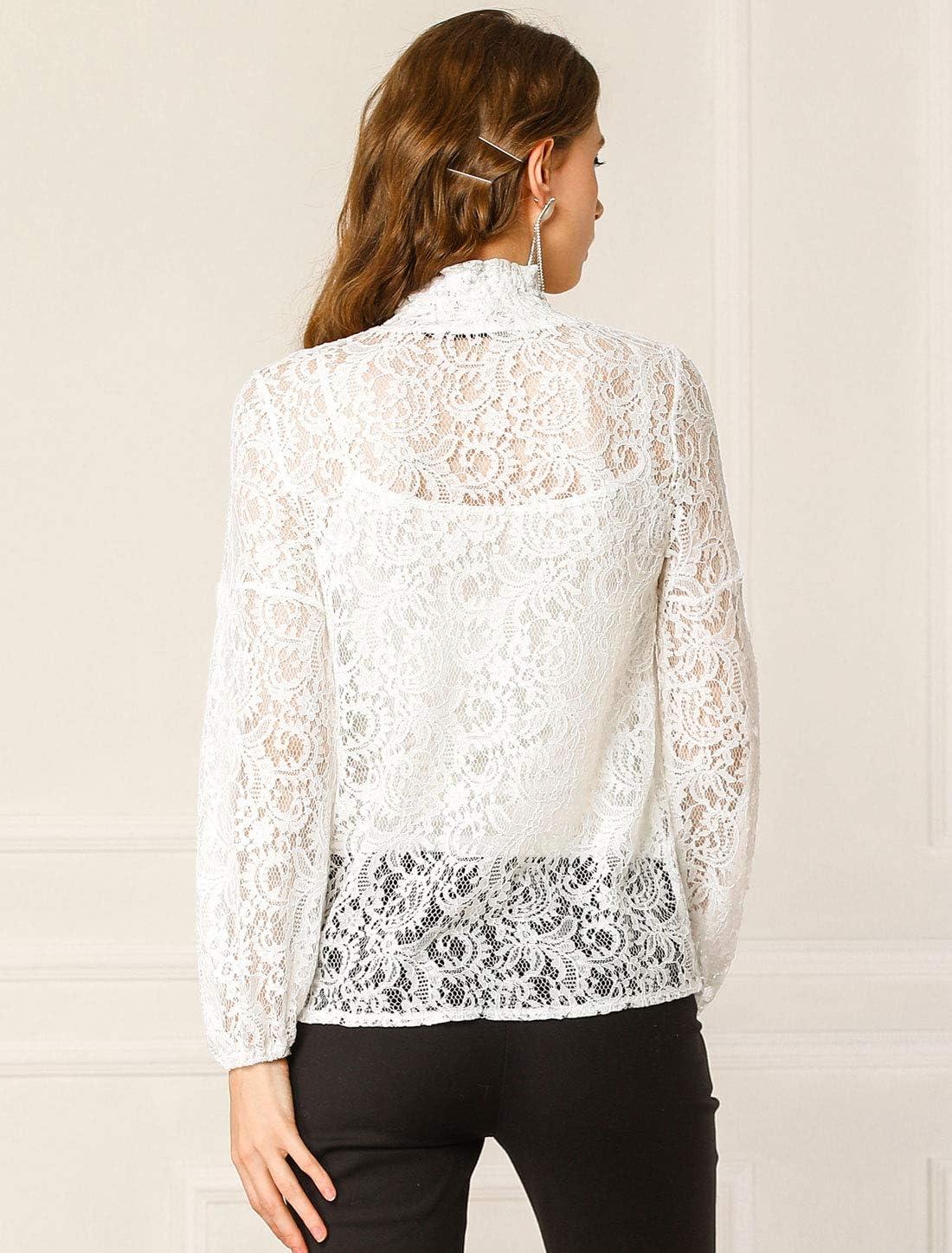 imageAllegra K Womens Floral Lace Top Turtleneck Puff Long Sleeve See Through Sheer BlouseWhite