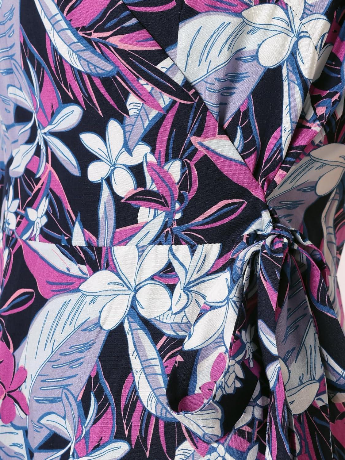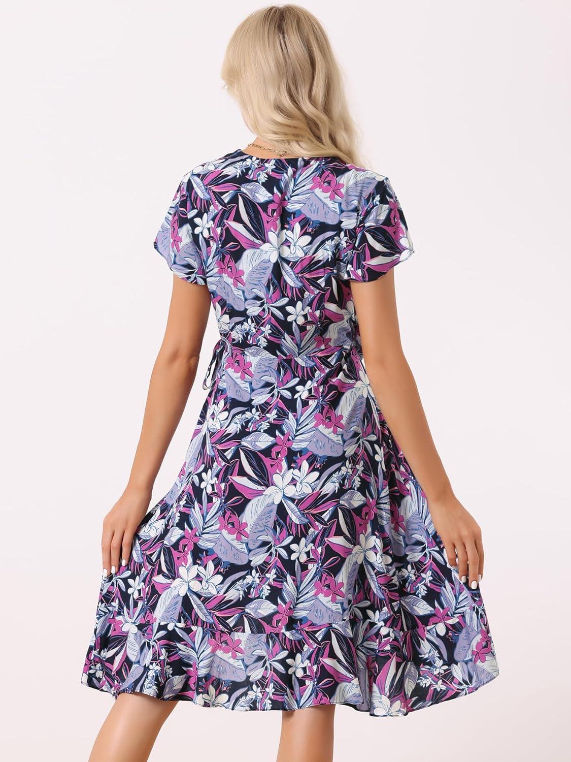 Allegra K Women’s Floral Leaves Wrap Dress Tie Waist Hawaiian Beach Tropical Summer Dress(Navy Blue)