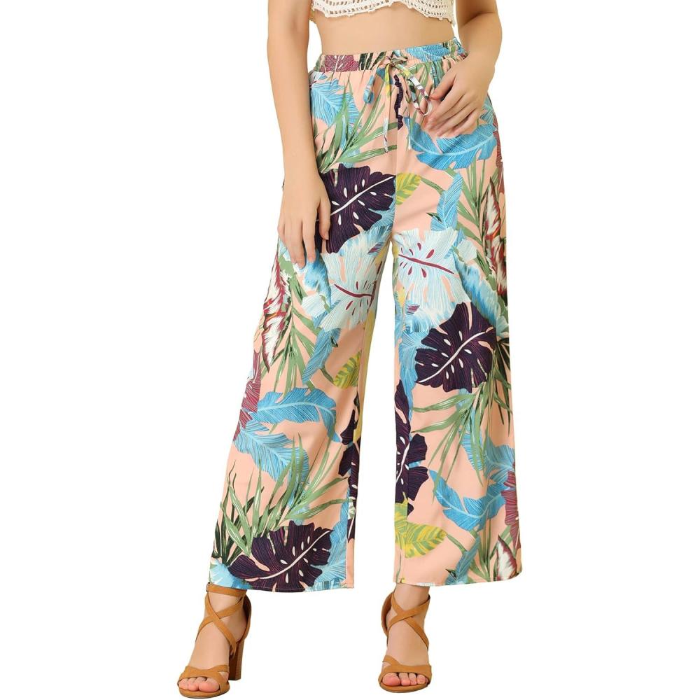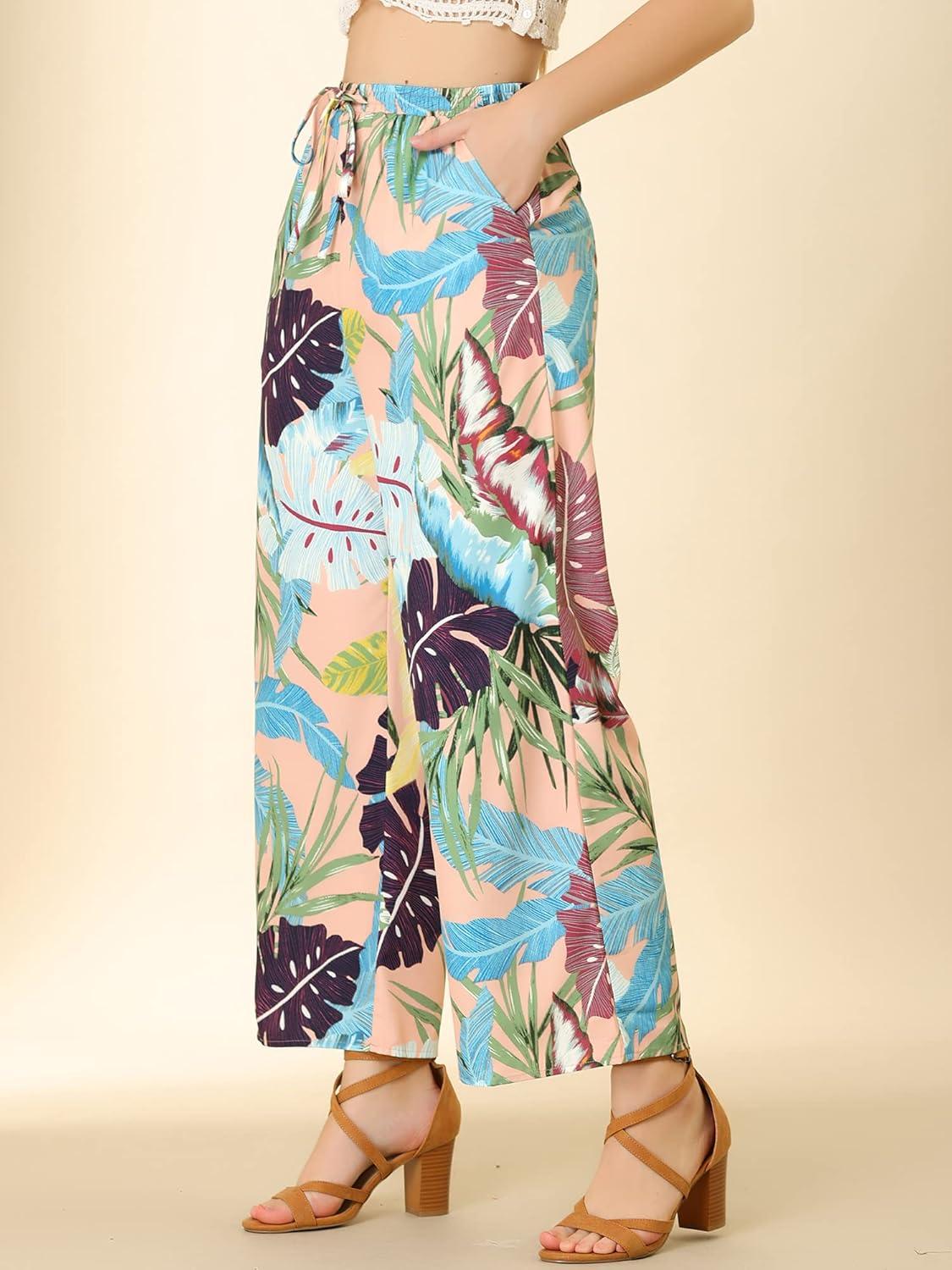 Allegra K Women’s Floral Palazzo Elastic Waist Casual Wide Leg Tropical Beach Pants(Pink)