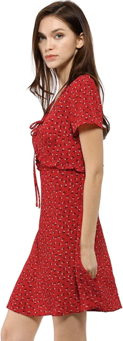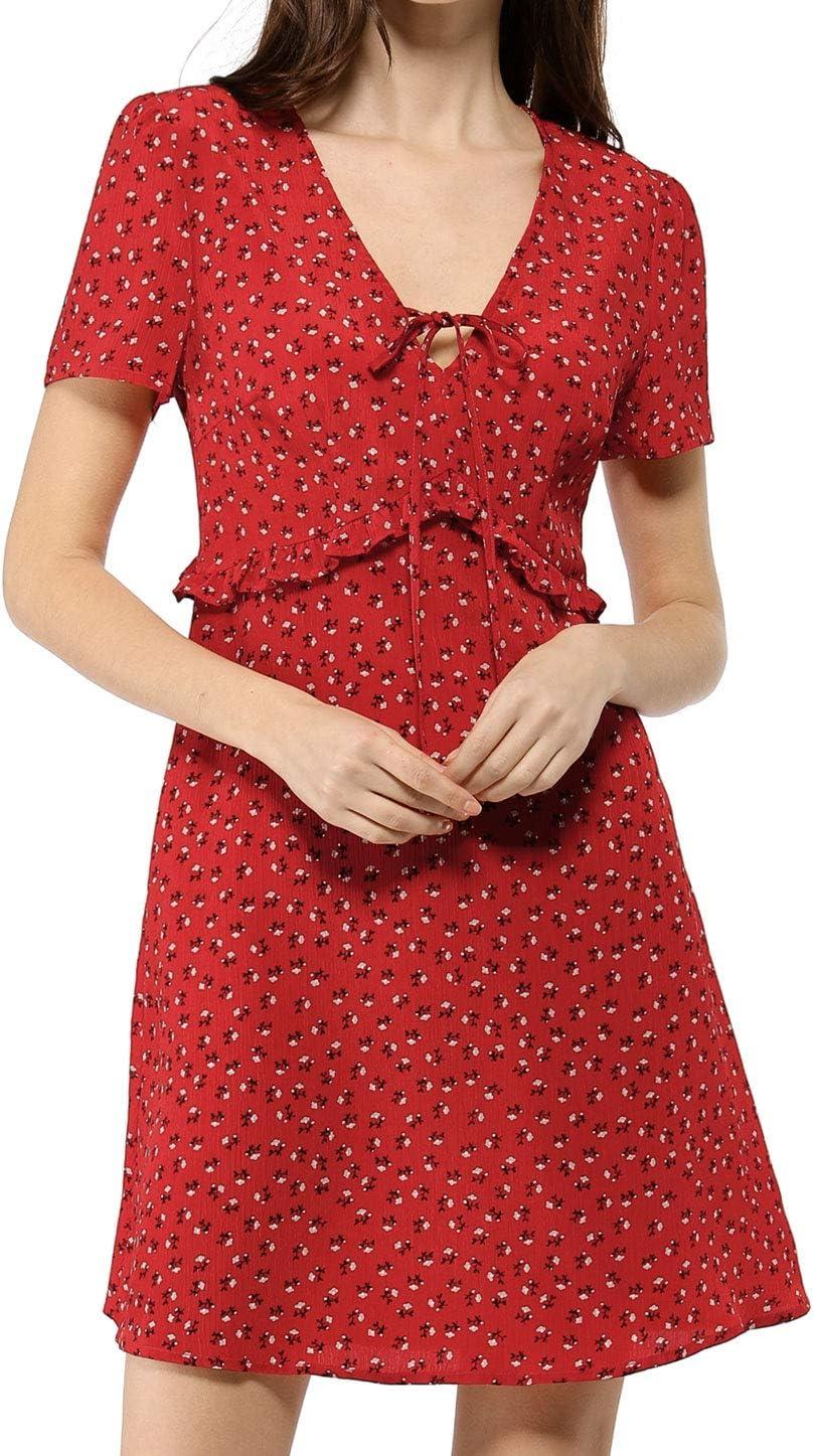 Allegra K Women’s Floral Ruffle Trim Tie Front Dresses Short Sleeve Summer Flowy Dress(Red)