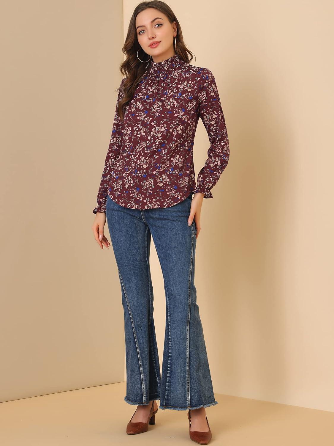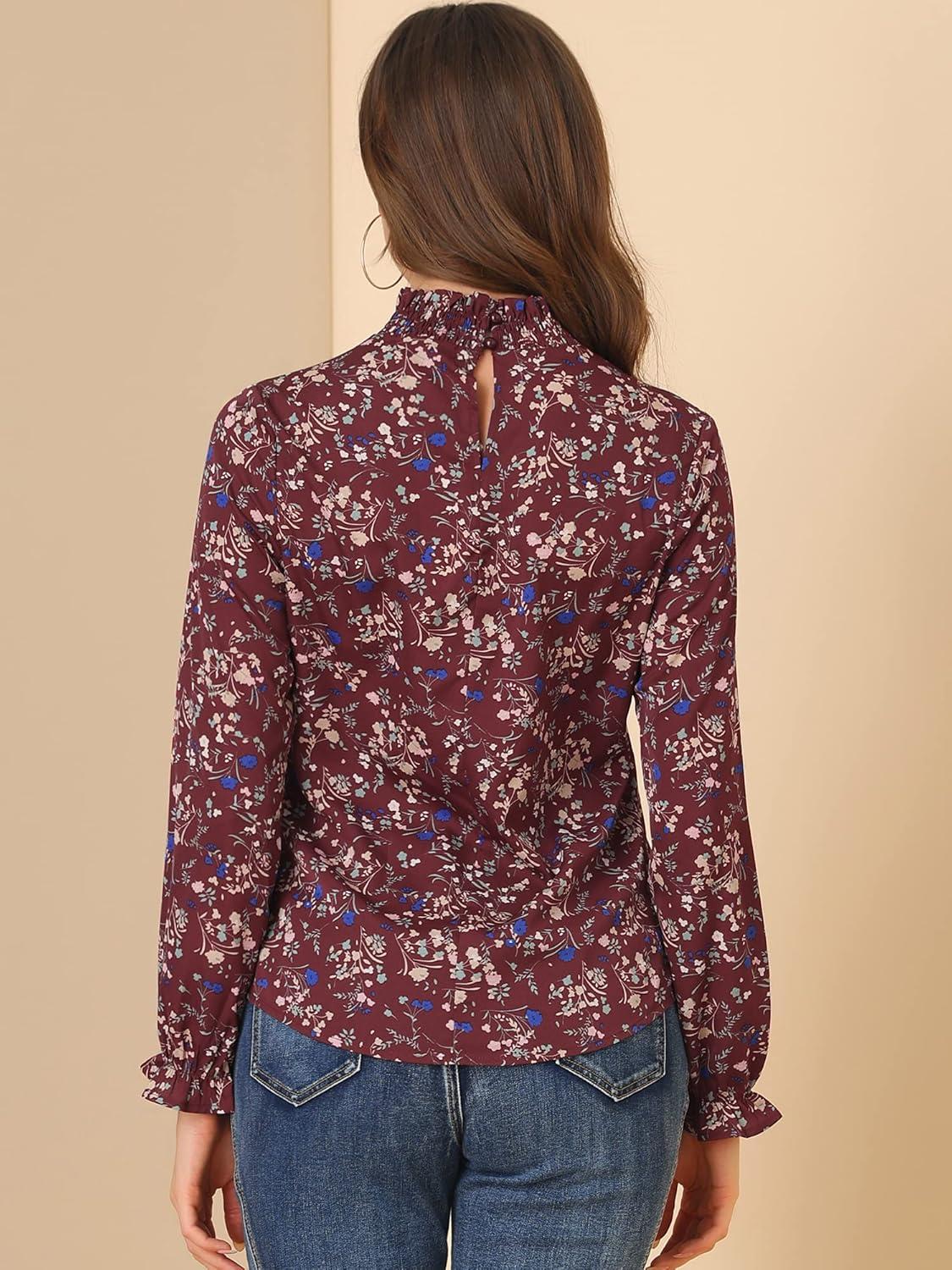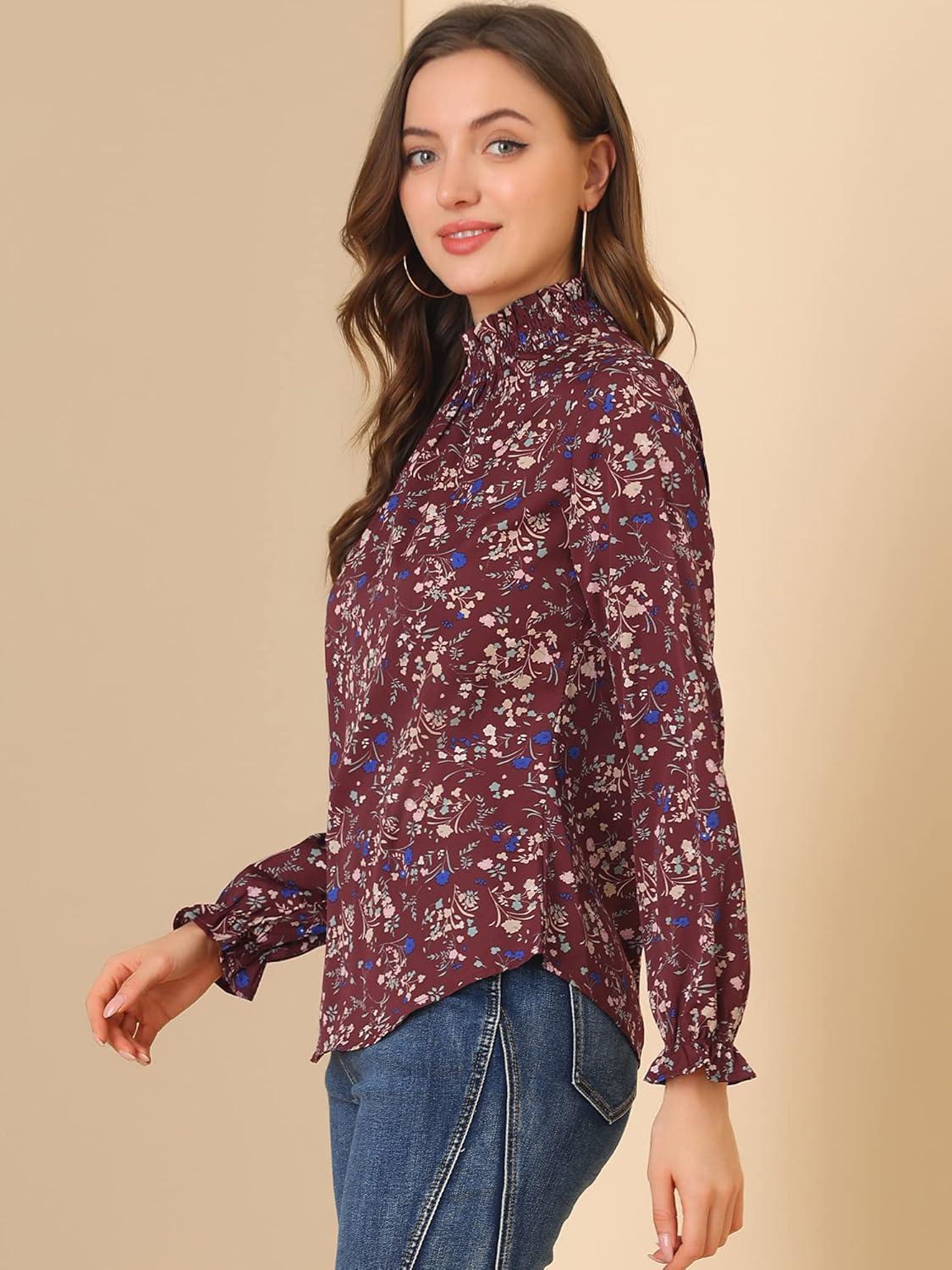 Allegra K Women’s Floral Ruffled Vintage Boho Long Sleeve Mock Neck Blouse(Burgundy)
