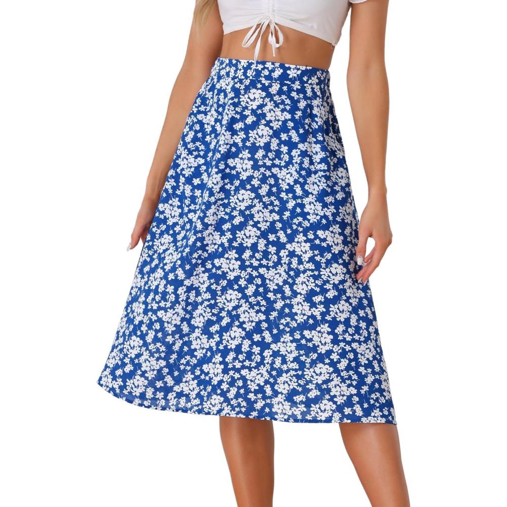Allegra K Women's Floral Skirt A-Line Midi Skirt Chiffon Elegant 2025 Fall Skirts with Pockets(Blue White)