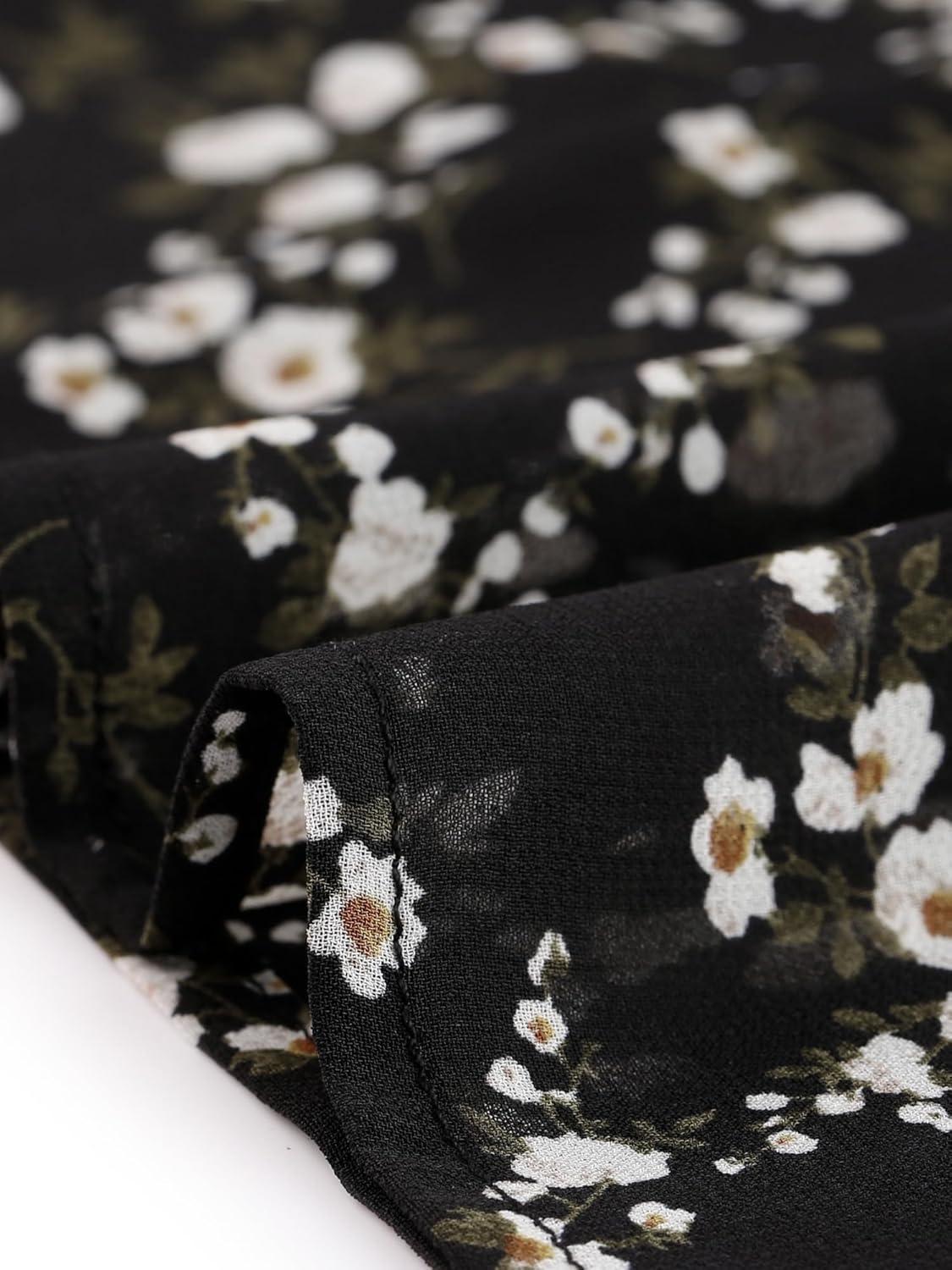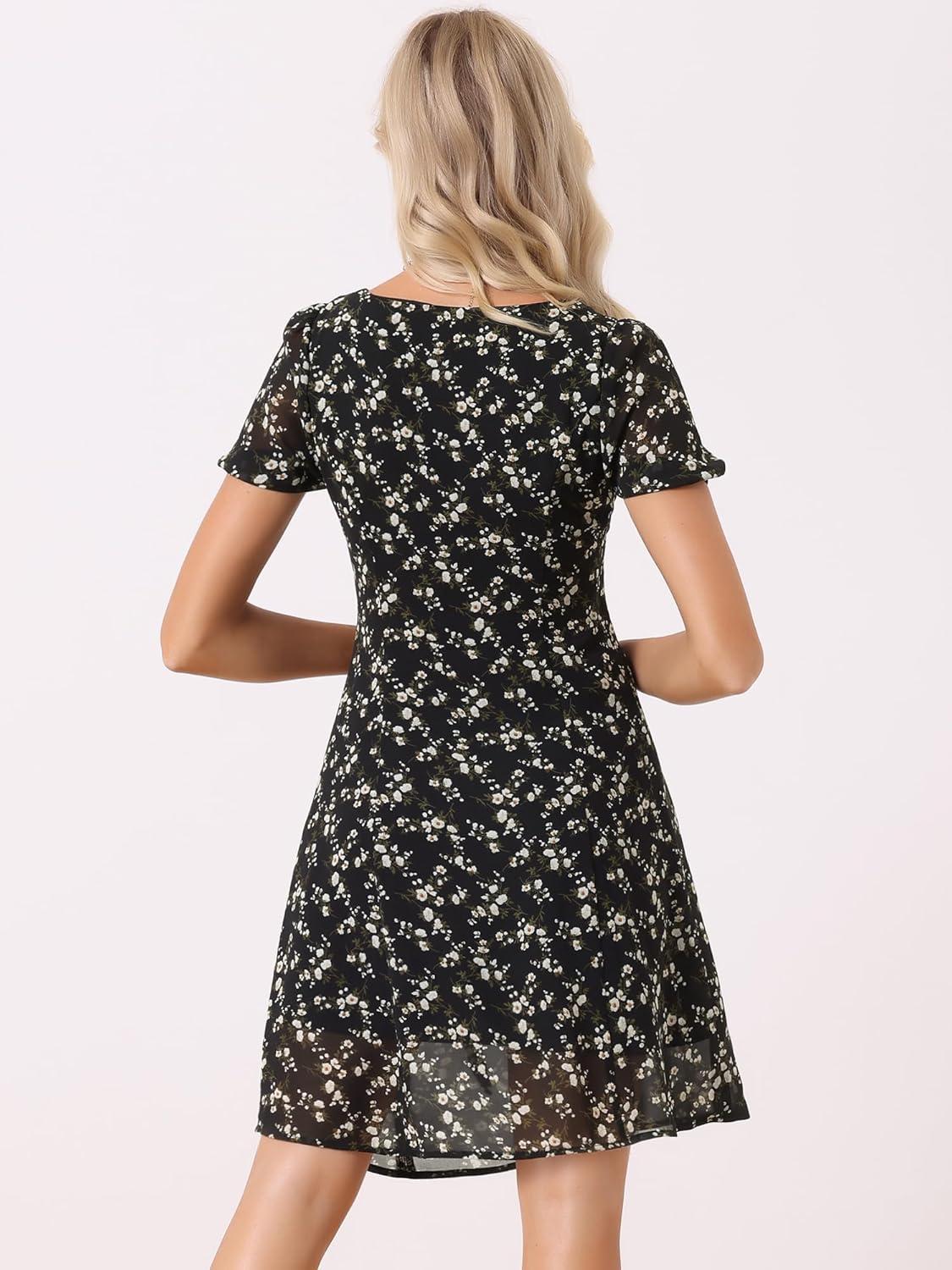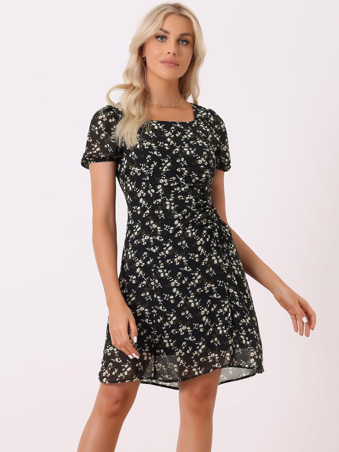 Allegra K Women’s Floral Square Neck Short Sleeve Drawstring Ruched Dress(Black)