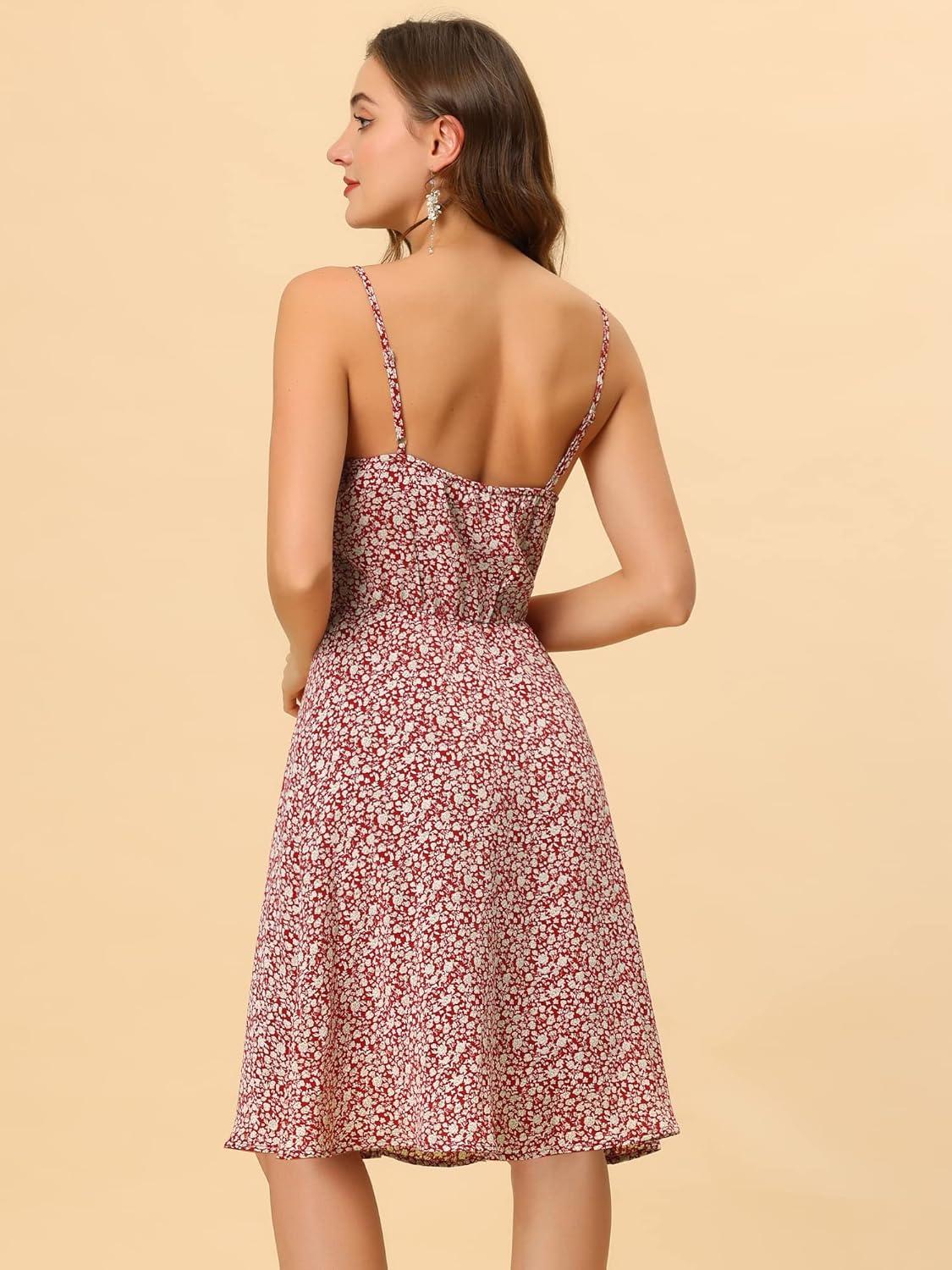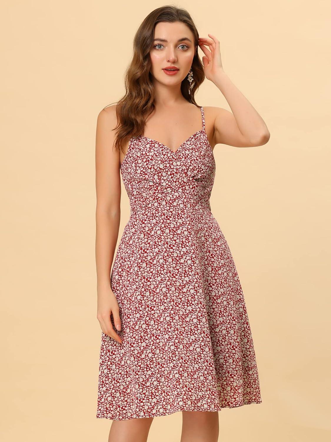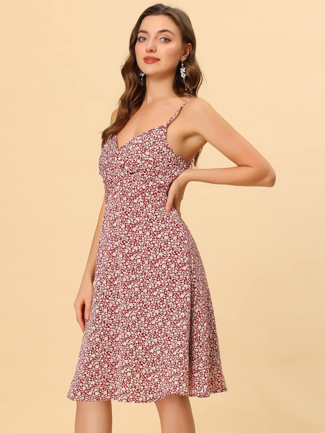 Allegra K Women’s Floral Twist Front Knee Length Summer Adjustable Strap Dress(Red)
