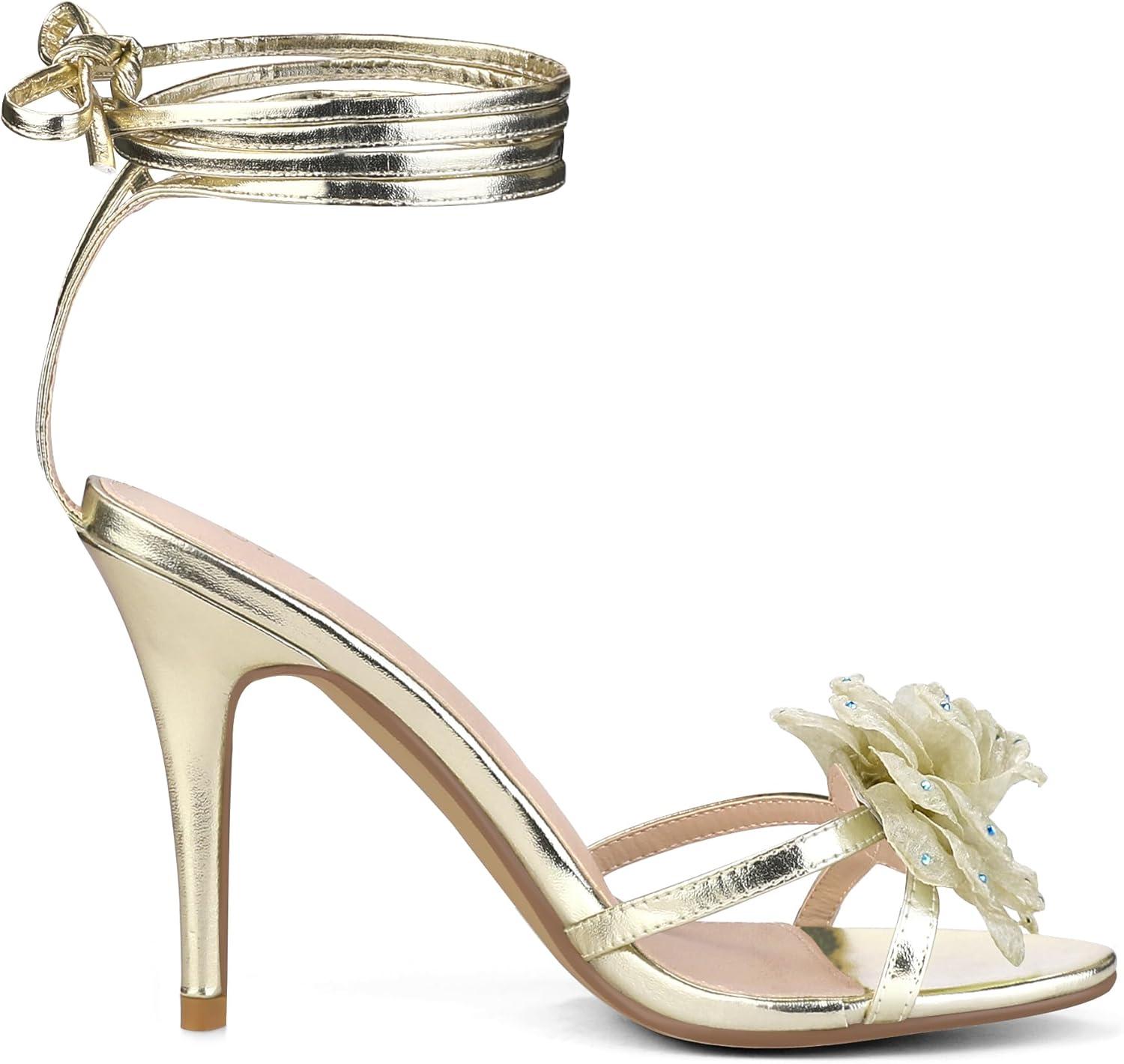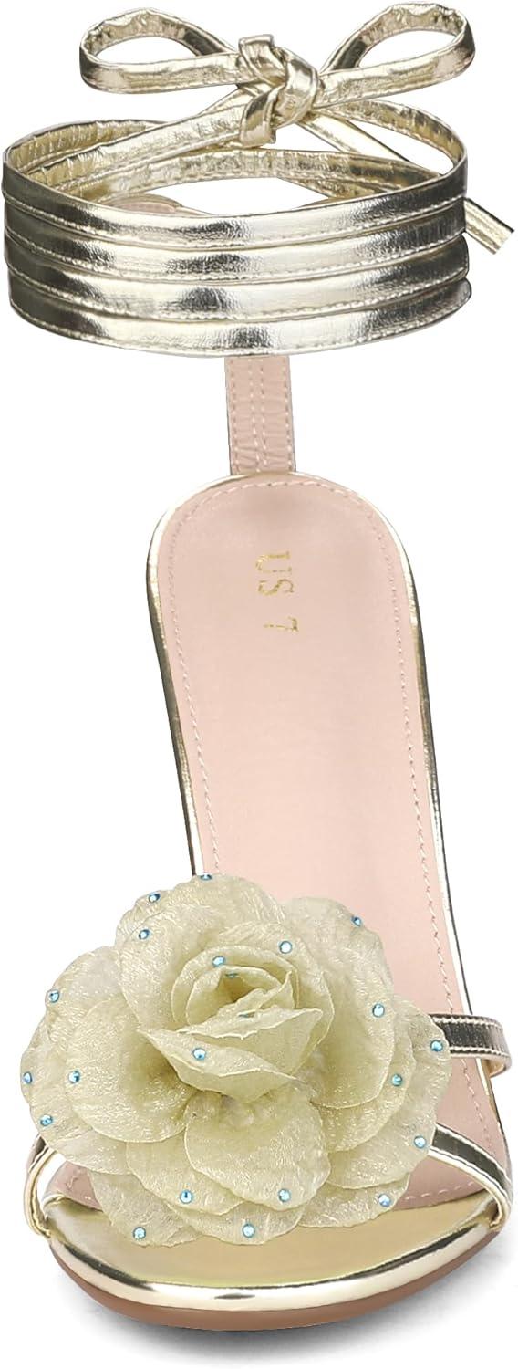 Allegra K Women's Flower Heels Strappy Lace Up Stiletto Heels Sandals(Gold)