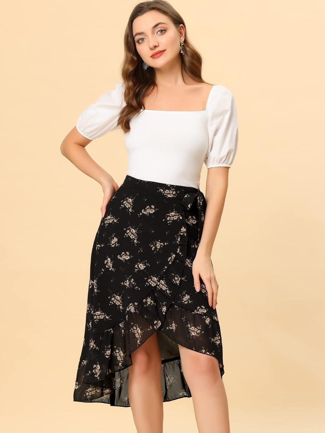 Allegra K Women’s Flowy Summer Chiffon Skirt Ruffle Hem High Low Floral Wrap Skirts