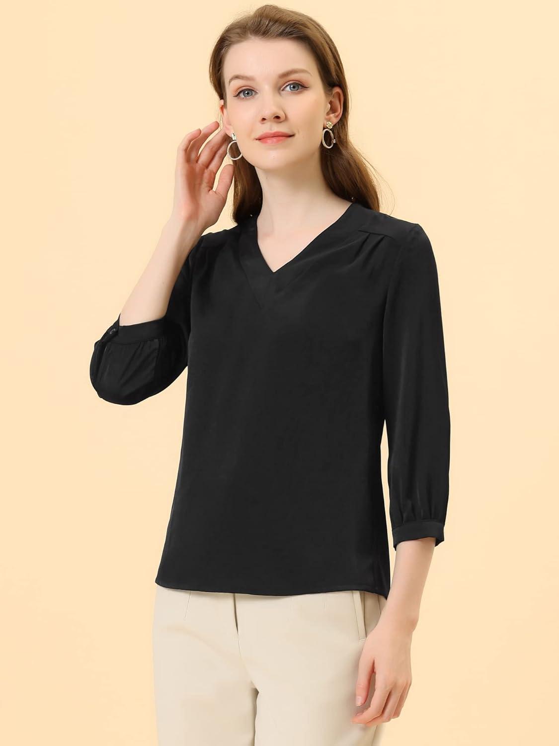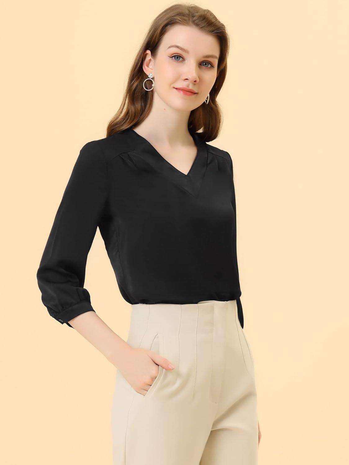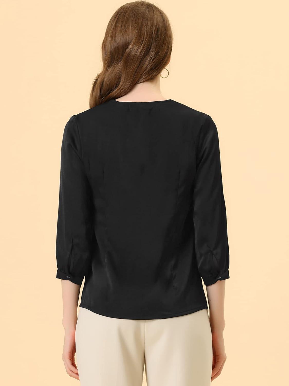 Allegra K Women’s Formal Blouse Dressy Office 3/4 Sleeve V Neck Satin Shirt(Black)