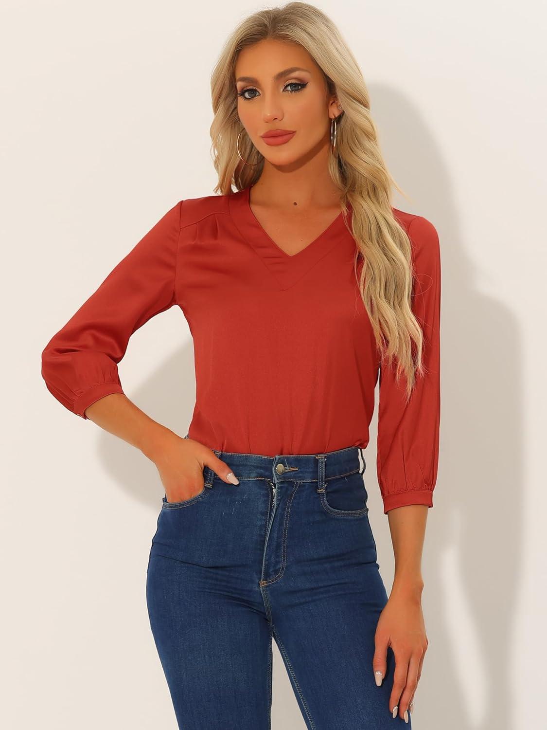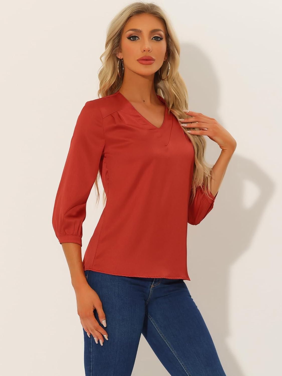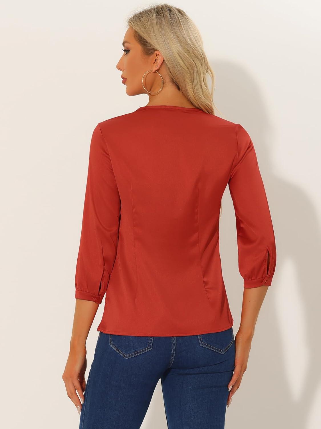 imageAllegra K Womens Formal Blouse Dressy Office 34 Sleeve V Neck Satin ShirtRed