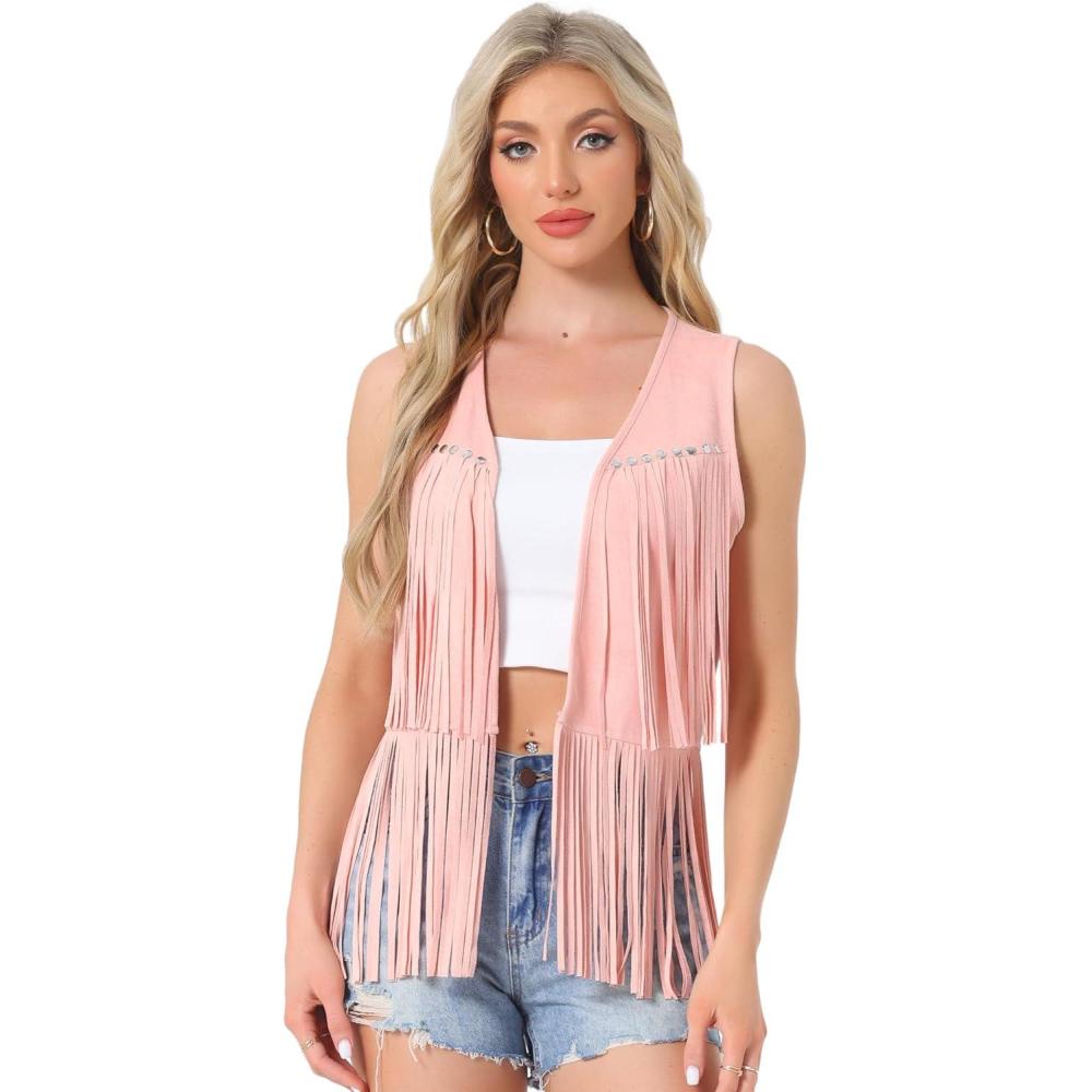 Allegra K Women’s Fringe Vest Open Front Western 70s Outfits Faux Suede Tassel Cardigan(Pink)