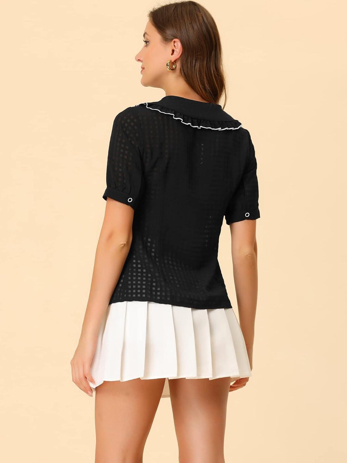 Allegra K Women’s Gingham Button Up Shirt Blouse Short Sleeve Peter Pan Collar Tops(Black)