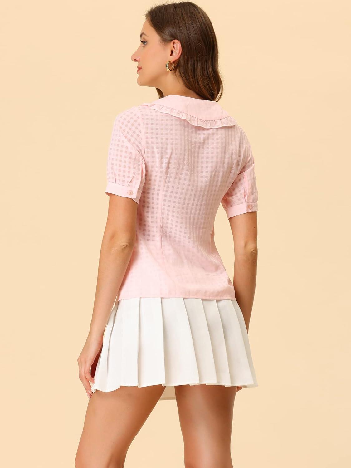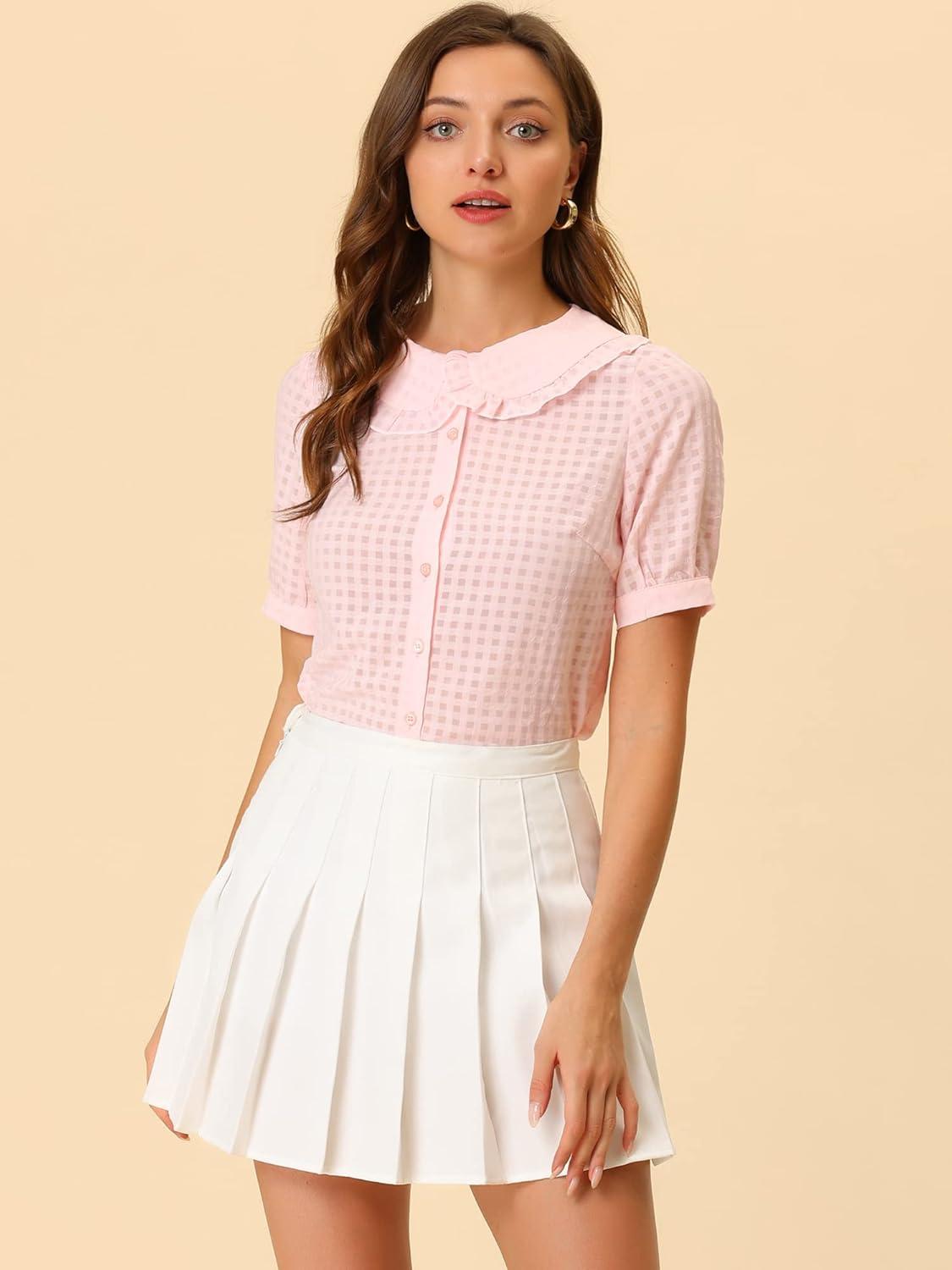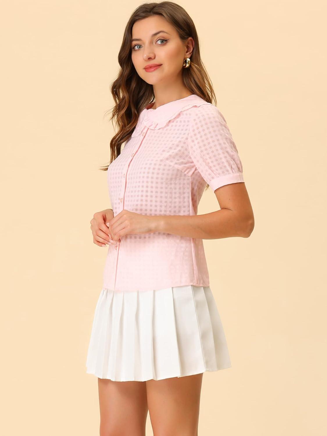 Allegra K Women’s Gingham Button Up Shirt Blouse Short Sleeve Peter Pan Collar Tops(Pink)