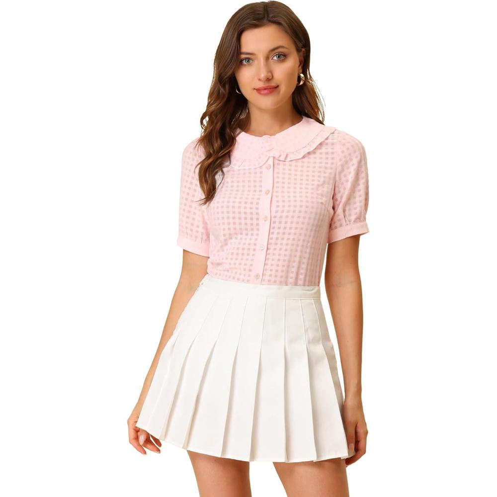 Allegra K Women’s Gingham Button Up Shirt Blouse Short Sleeve Peter Pan Collar Tops(White)