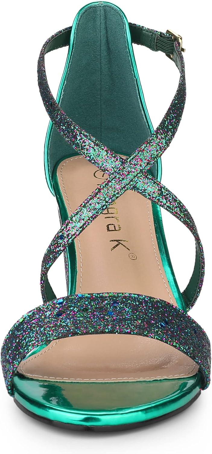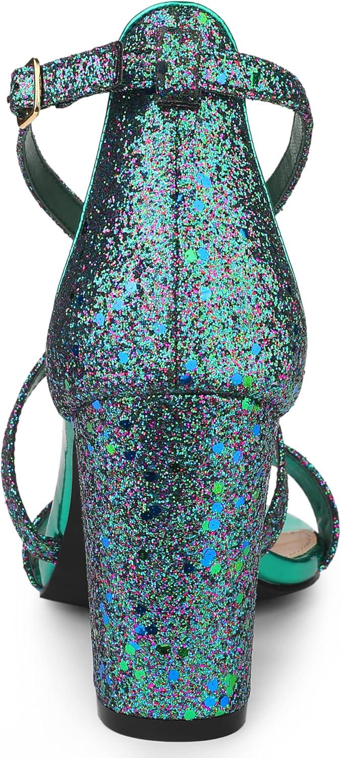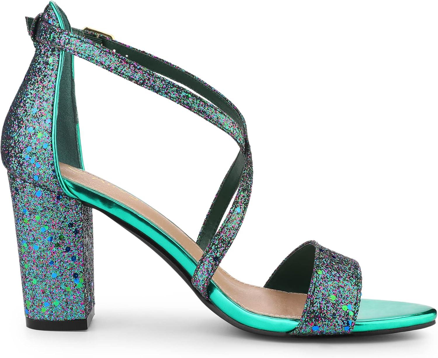 Allegra K Women’s Glitter Crisscross Strap Block Heels Sandals(Green)
