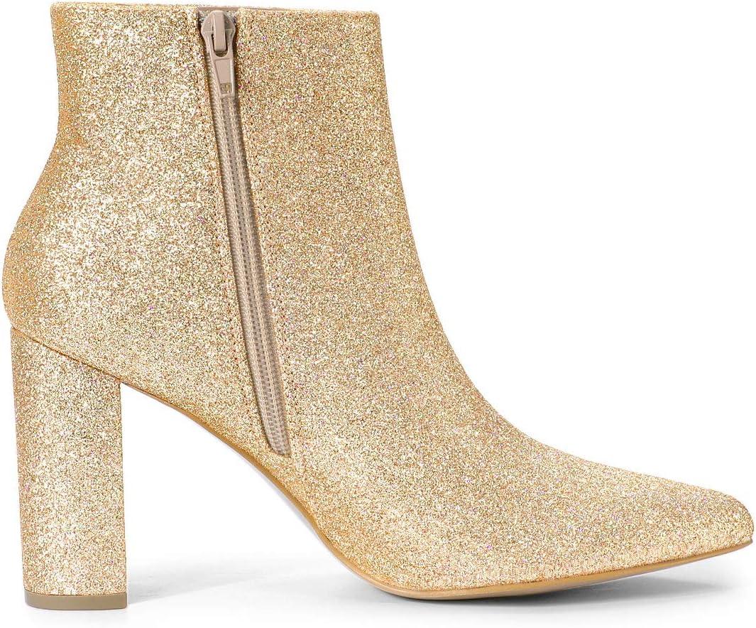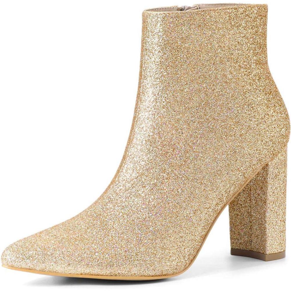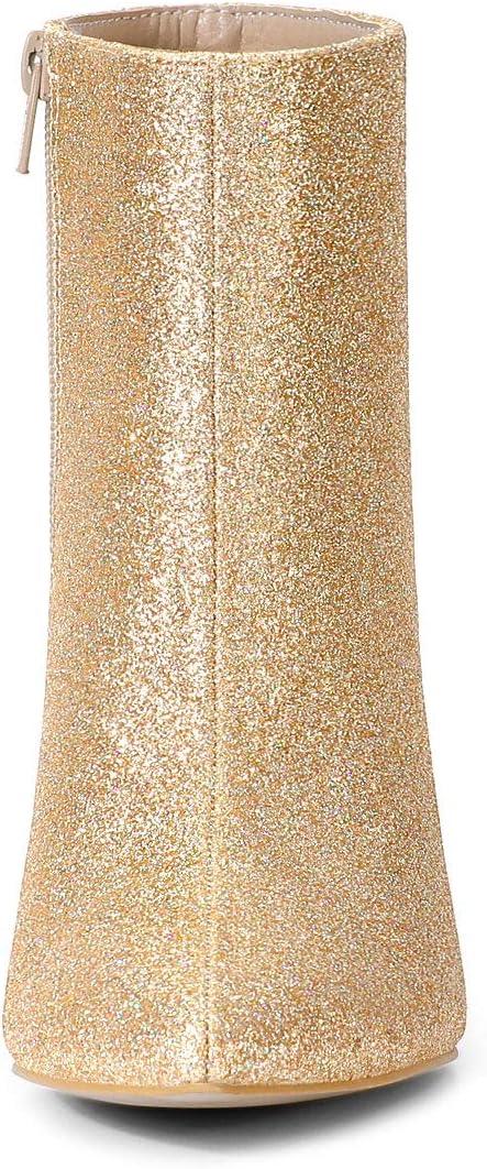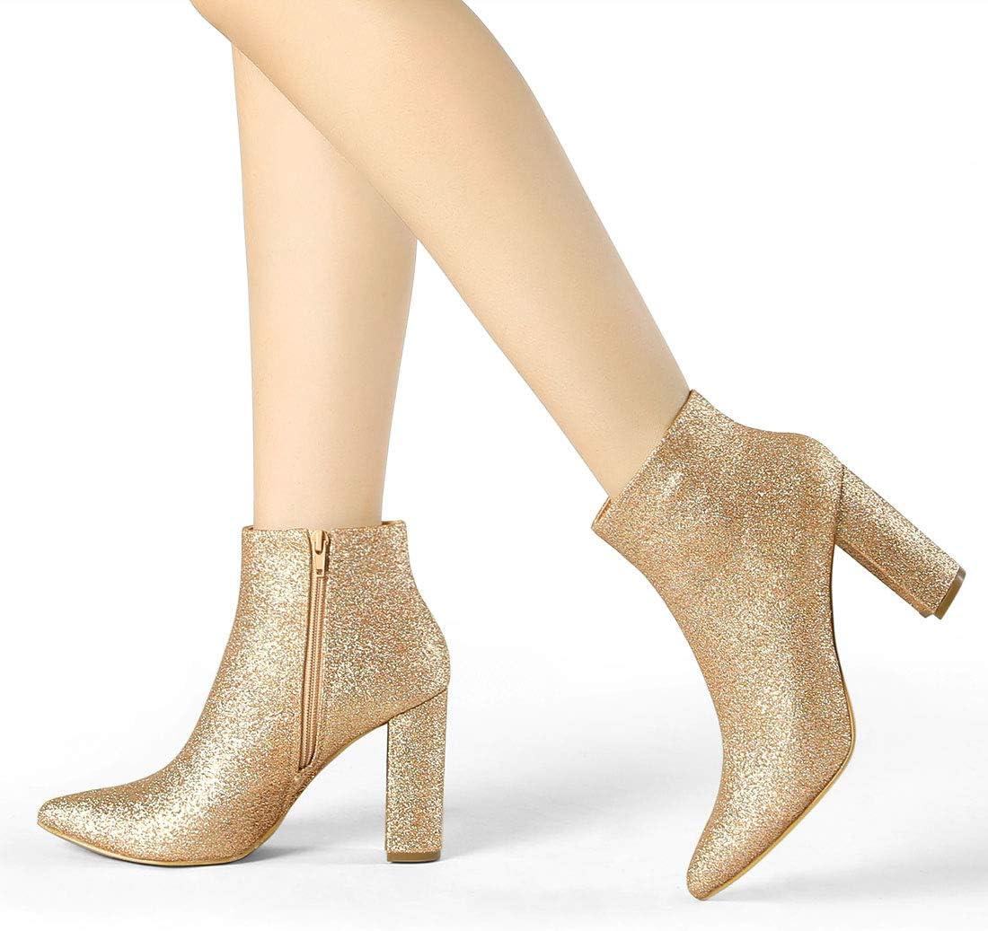 Allegra K Women’s Glitter Pointed Toe Chunky Heel Ankle Boots(Gold)
