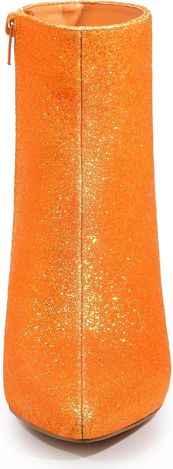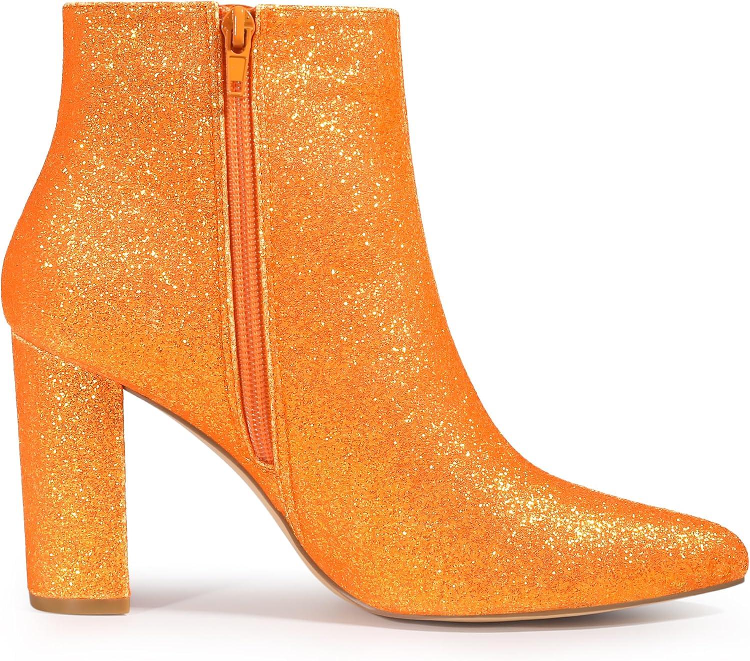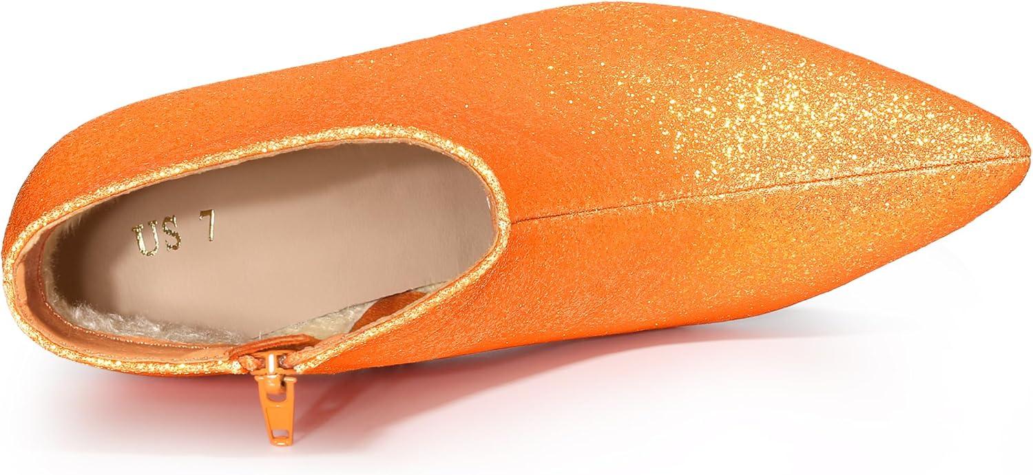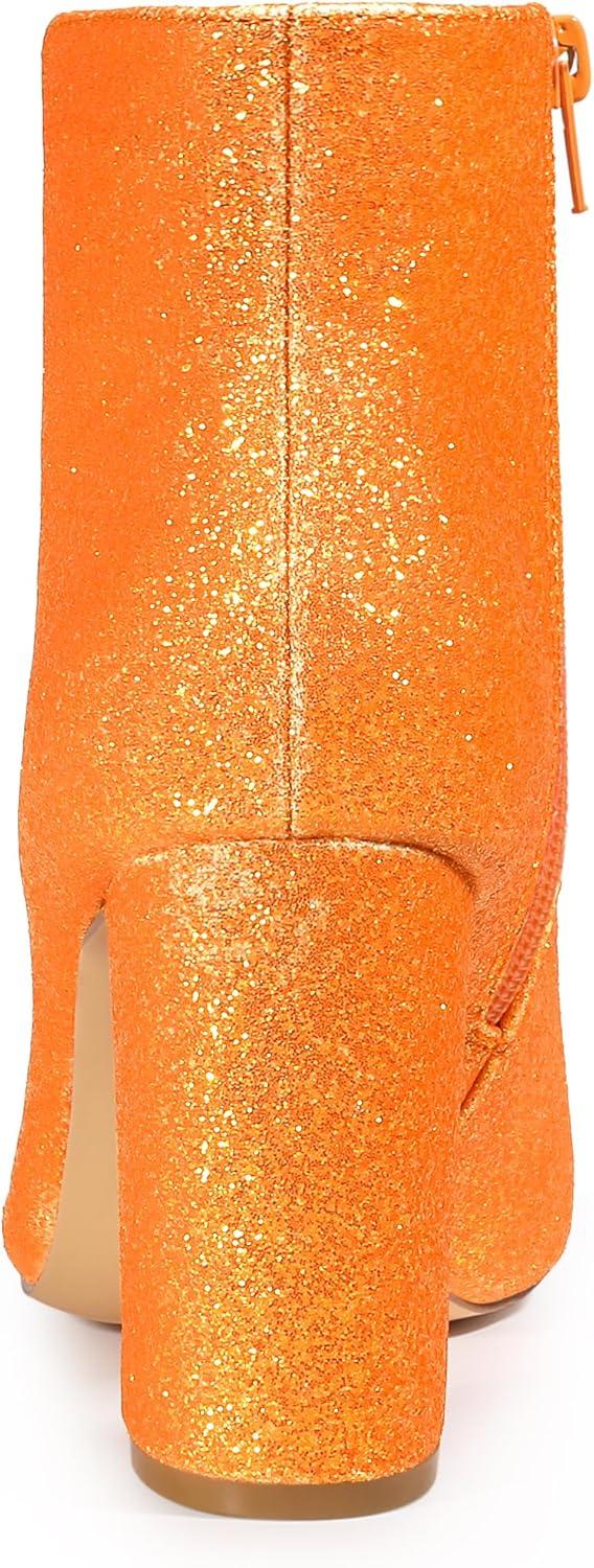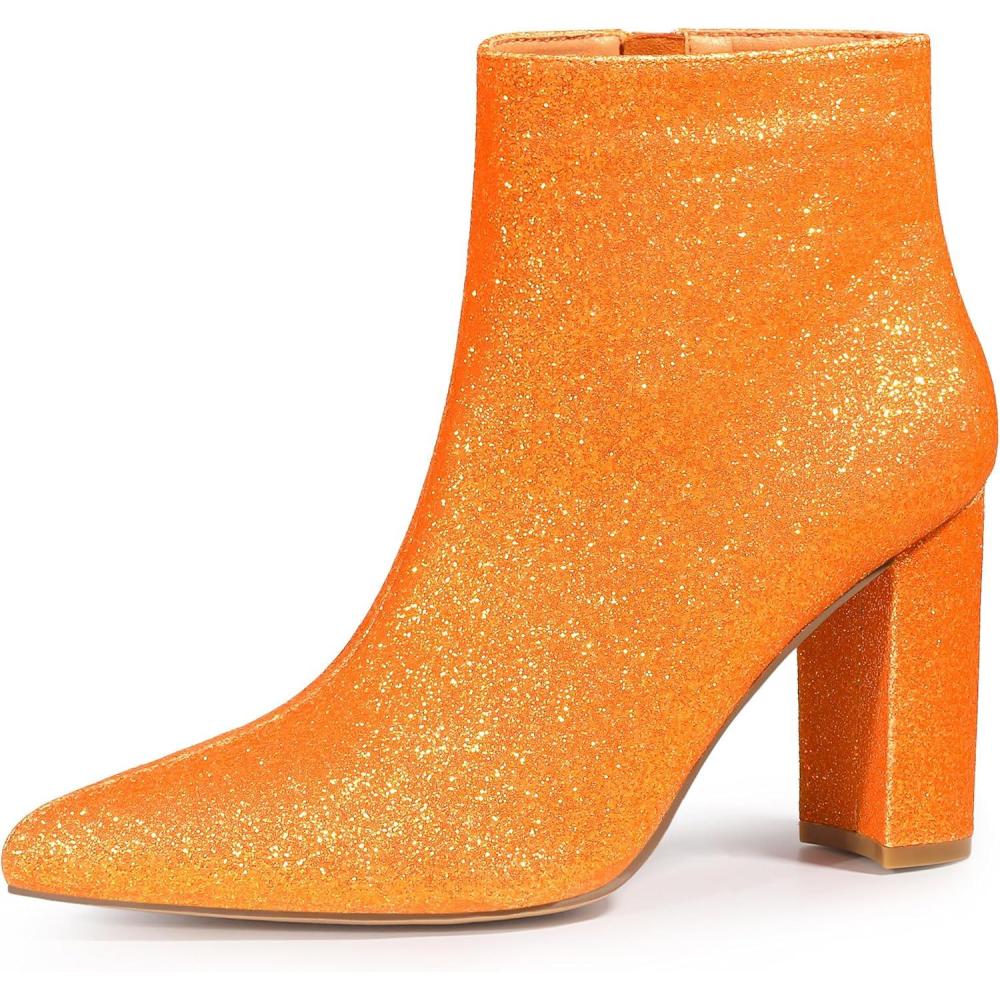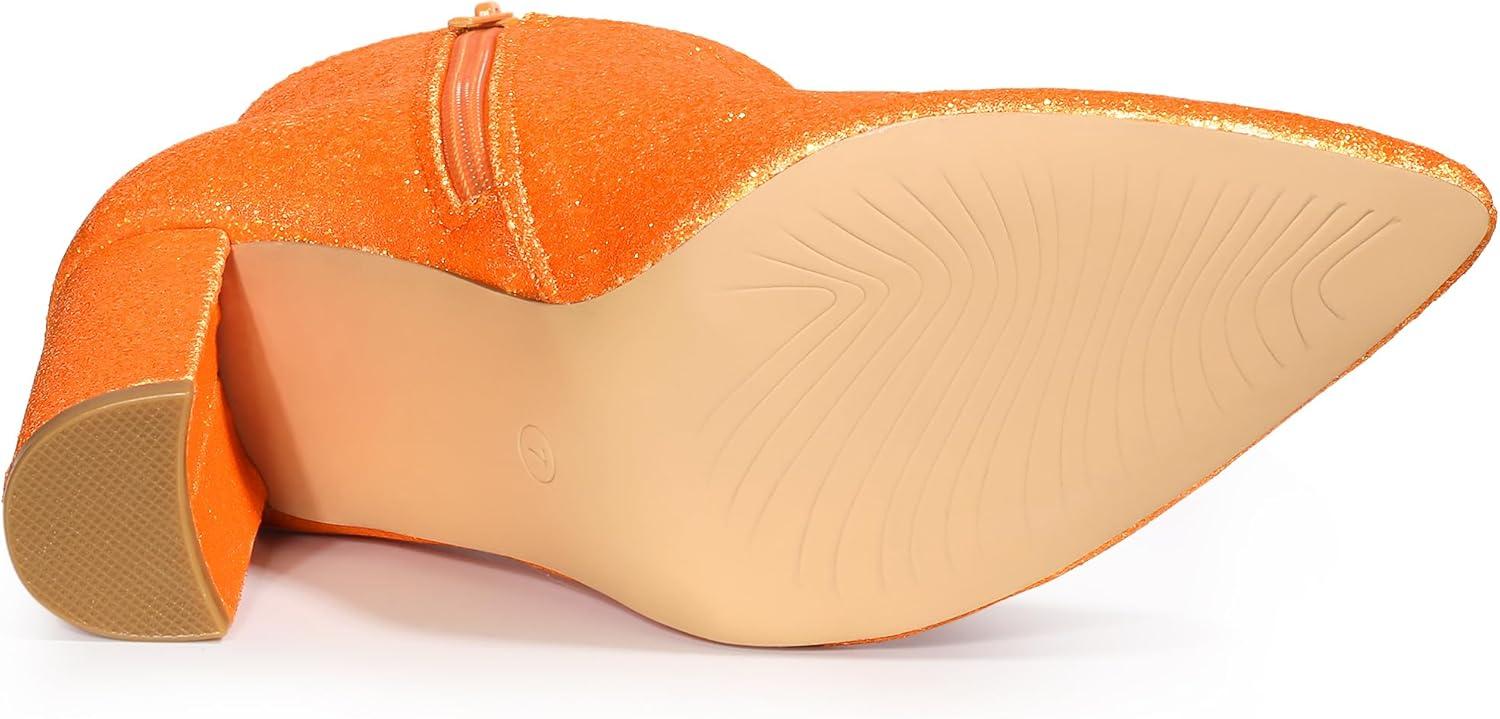 Allegra K Women’s Glitter Pointed Toe Chunky Heel Ankle Boots(Orange)