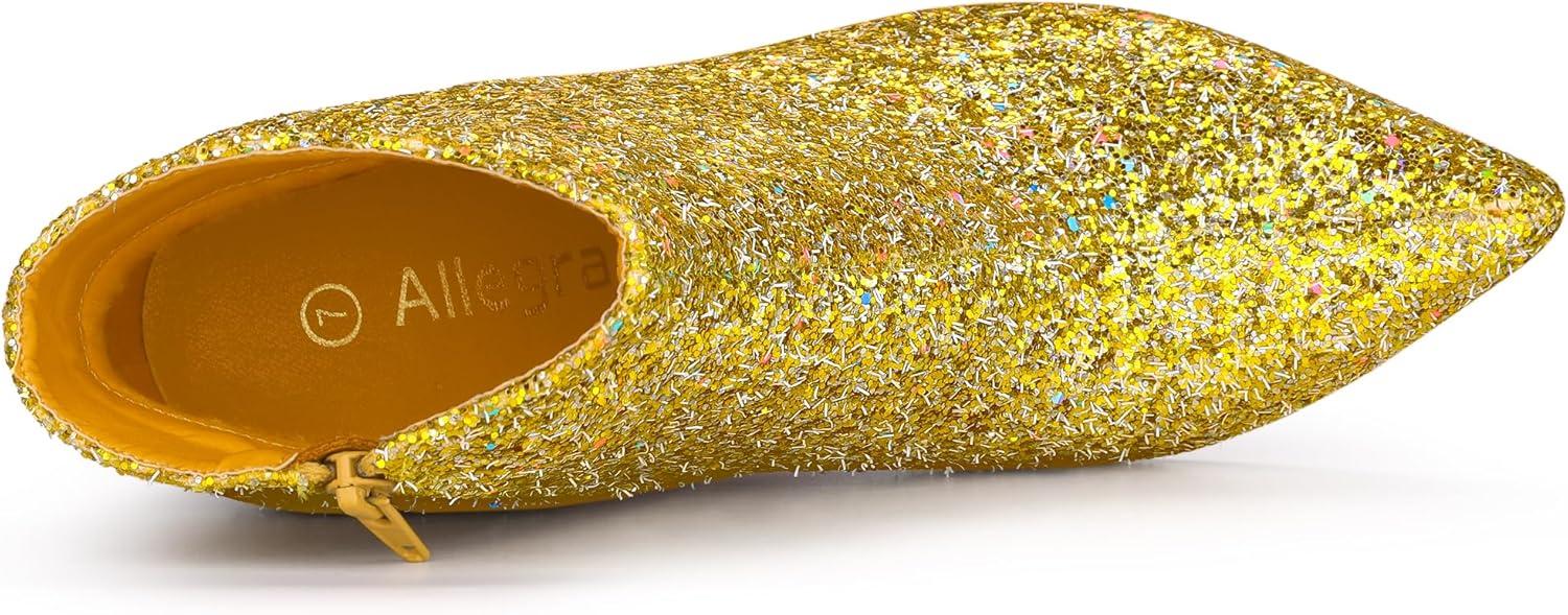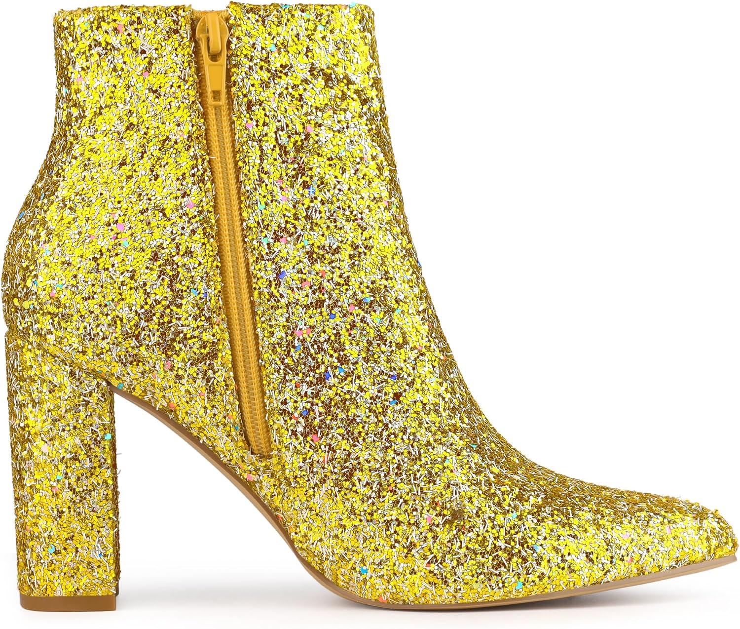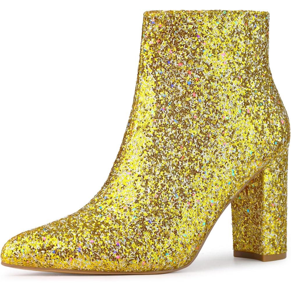 Allegra K Women’s Glitter Pointed Toe Chunky Heel Ankle Boots(Yellow Gold)