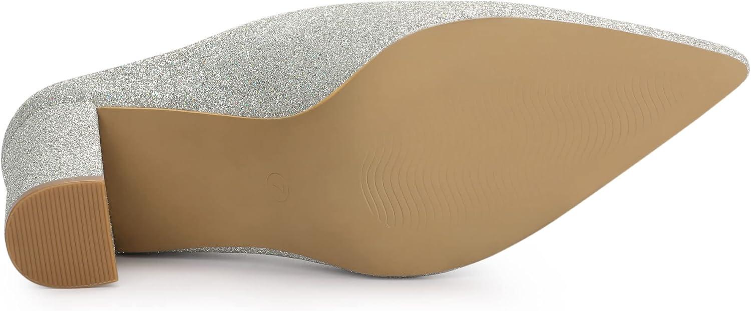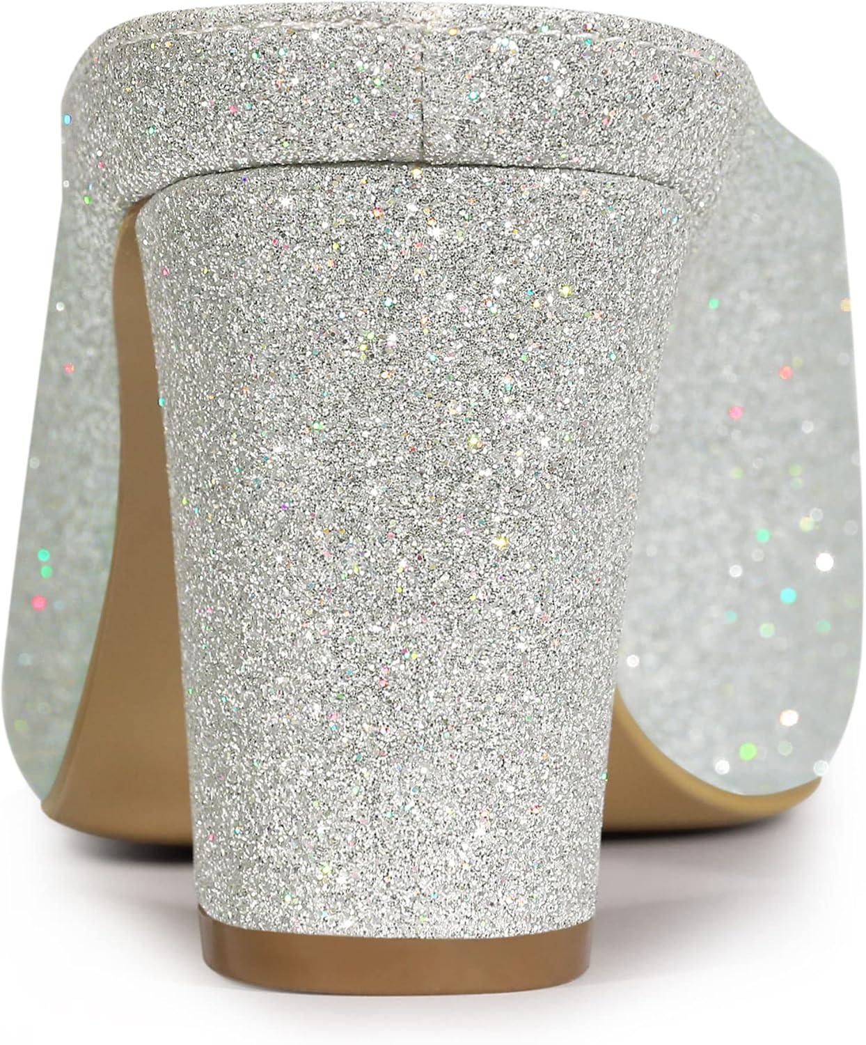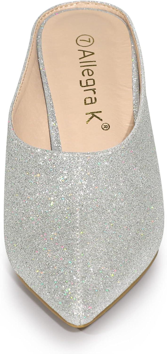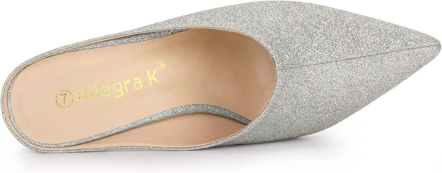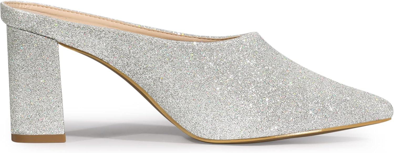 Allegra K Women’s Glitter Pointed Toe Slip on Chunky Heels Slide Mules(Silver)
