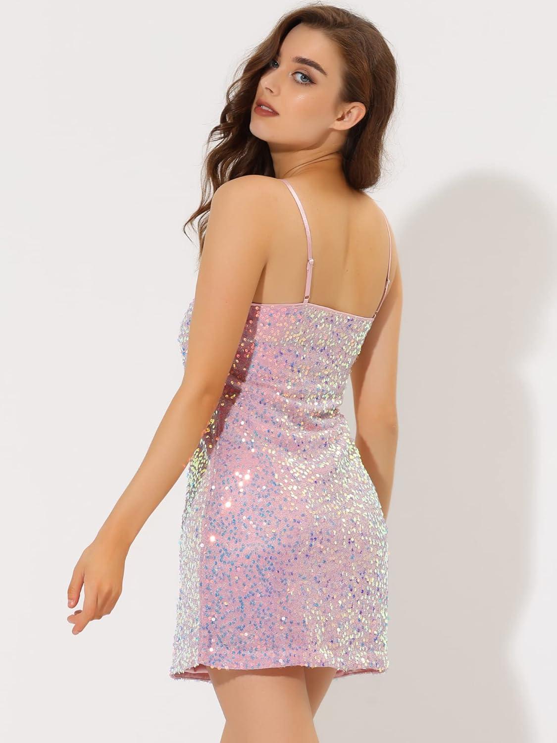 imageAllegra K Womens Glitter Sequin Dress Spaghetti Strap V Neck Party Cocktail Sparkly Mini Dress ClubwearPinks