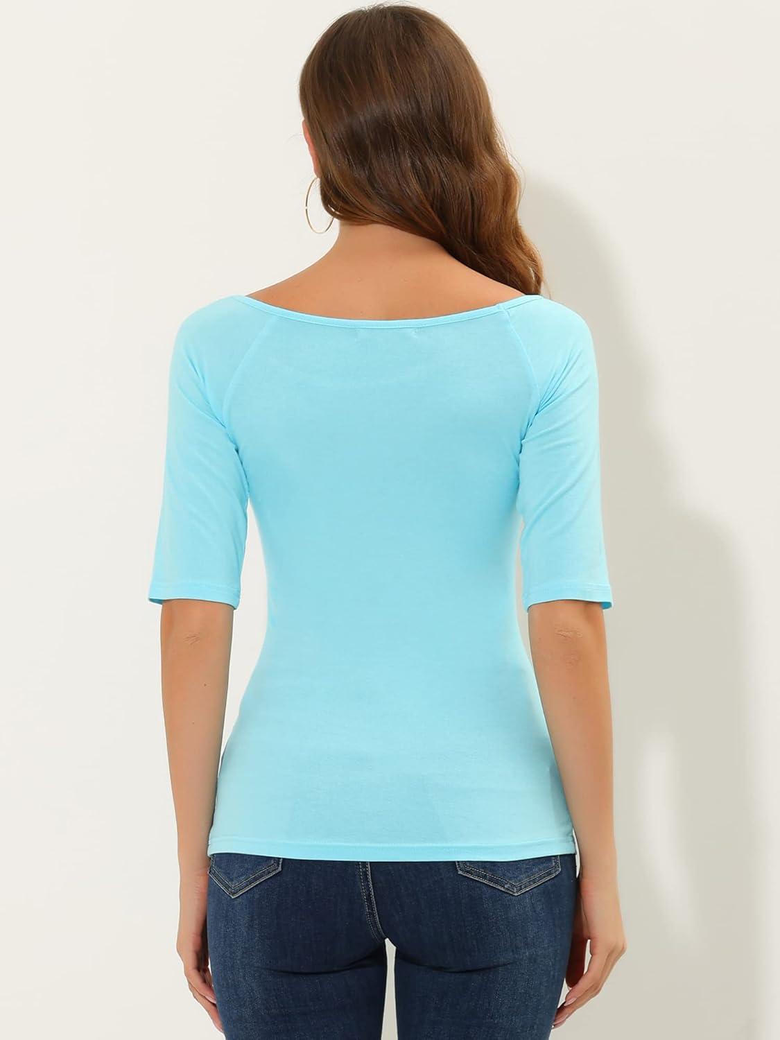 Allegra K Women's Half Sleeves Scoop Neck Fitted Layering Top Soft T-Shirt(Sky Blue)