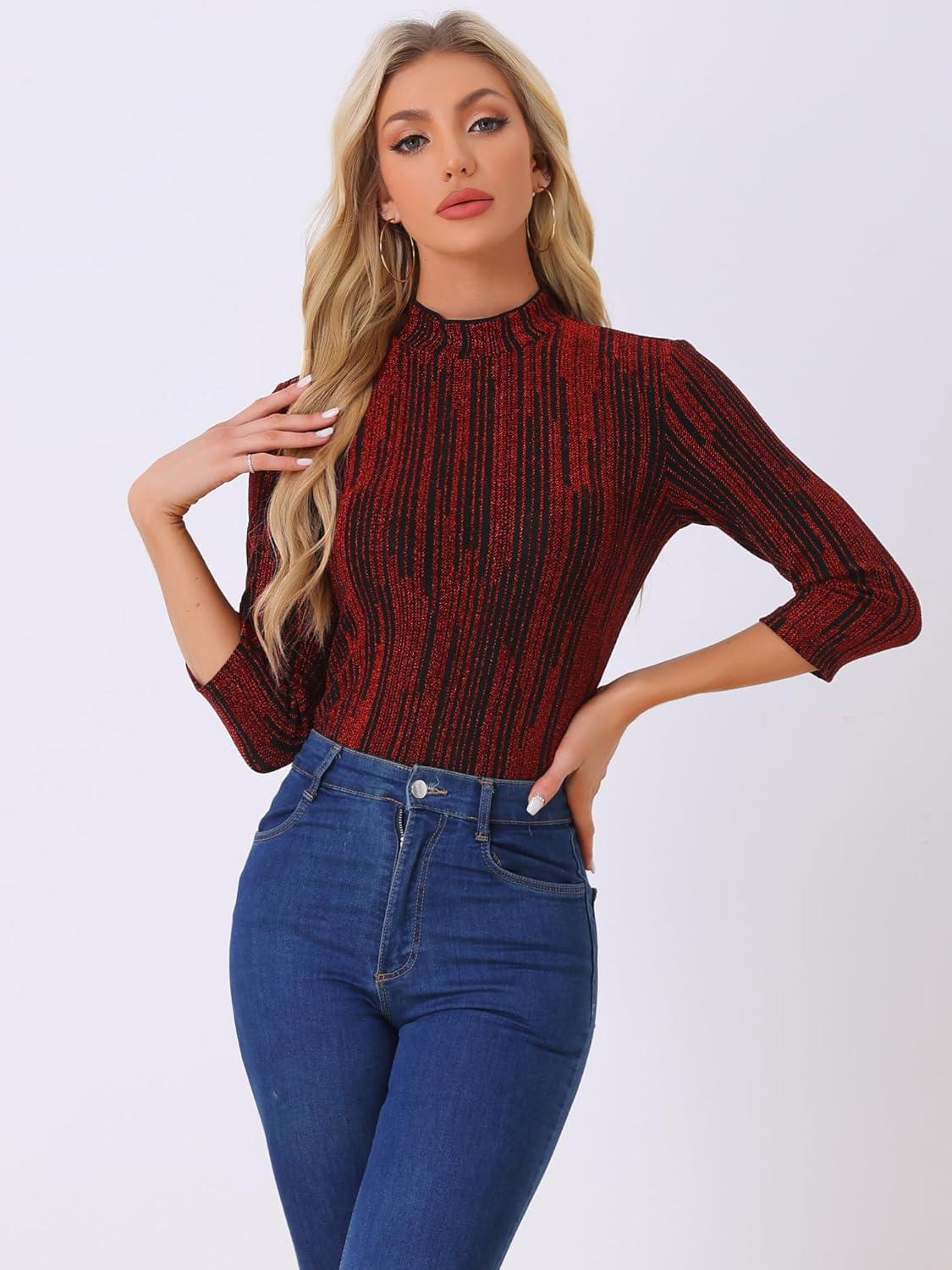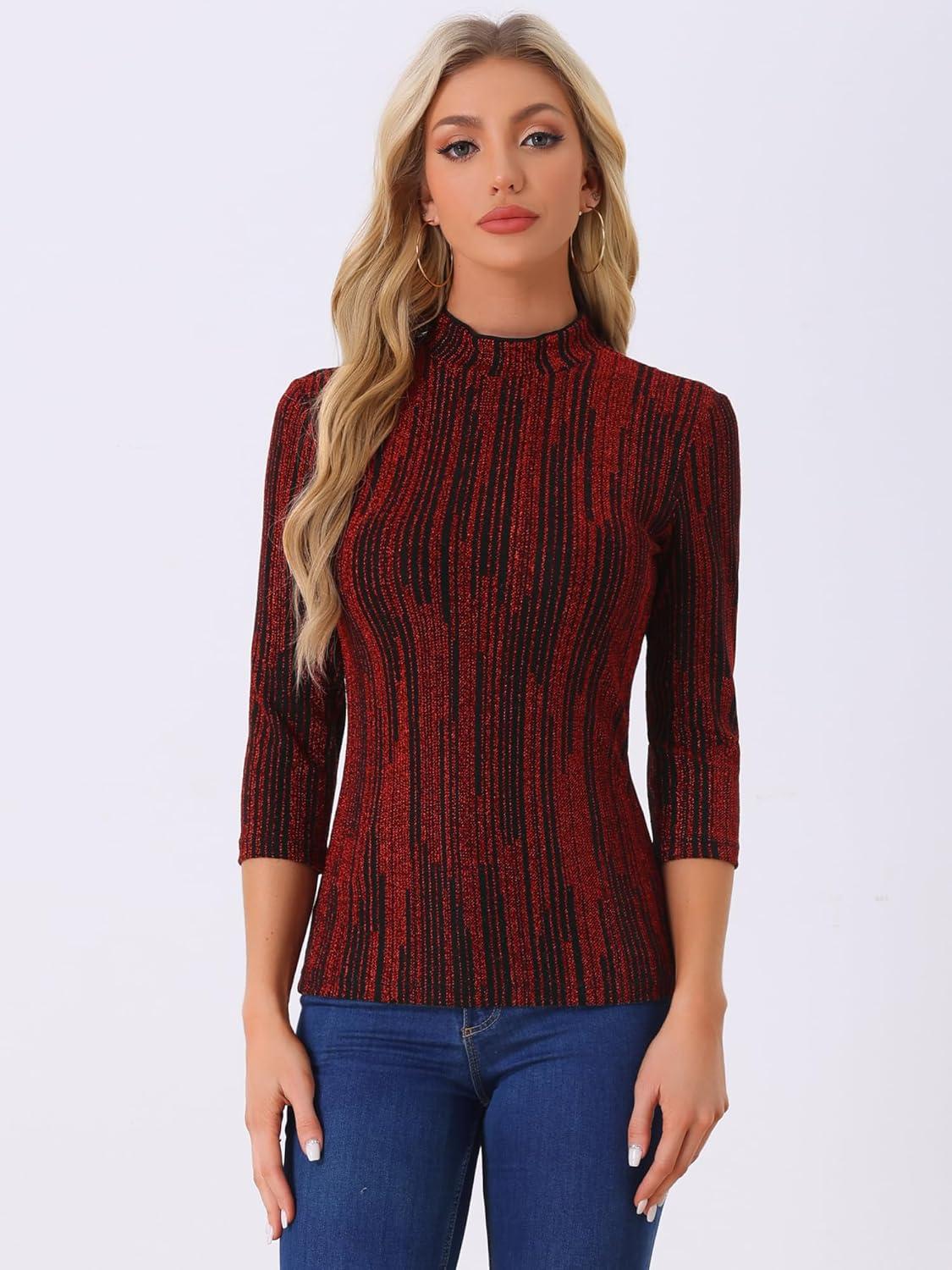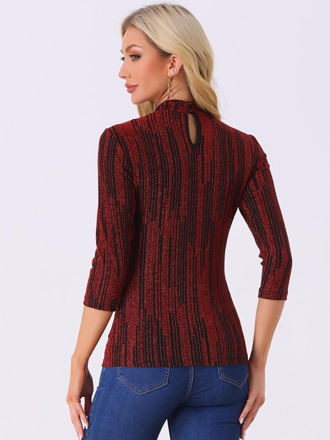 Allegra K Women's Halloween 3/4 Sleeve Glitter Party Sparkly Shiny Metallic Tops(Red)