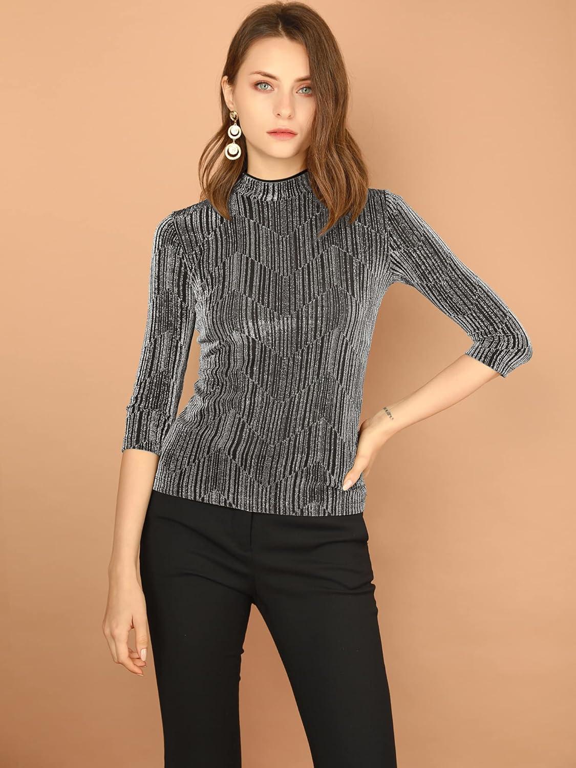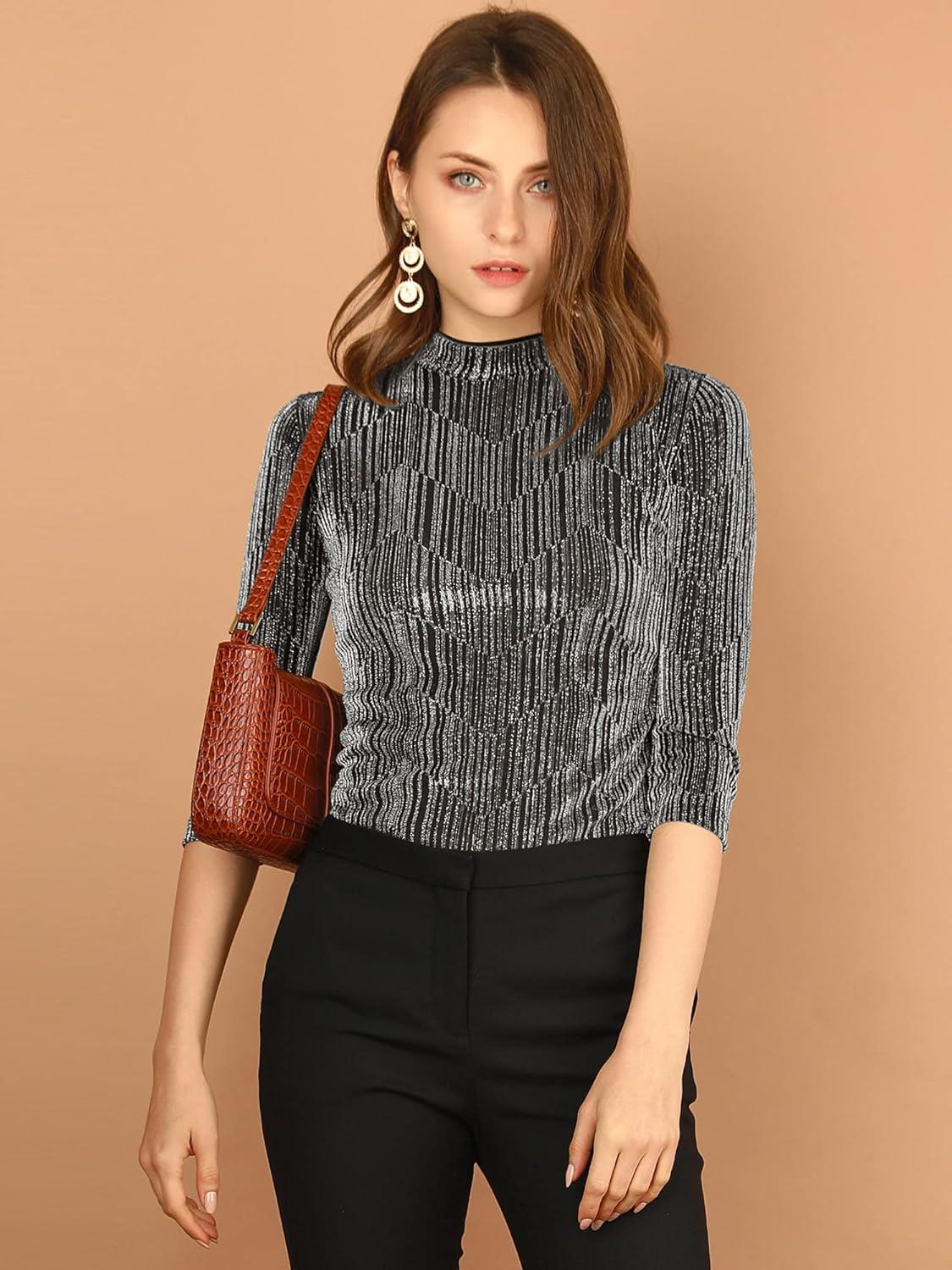 Allegra K Women's Halloween 3/4 Sleeve Glitter Party Sparkly Shiny Metallic Tops(Silver Black)