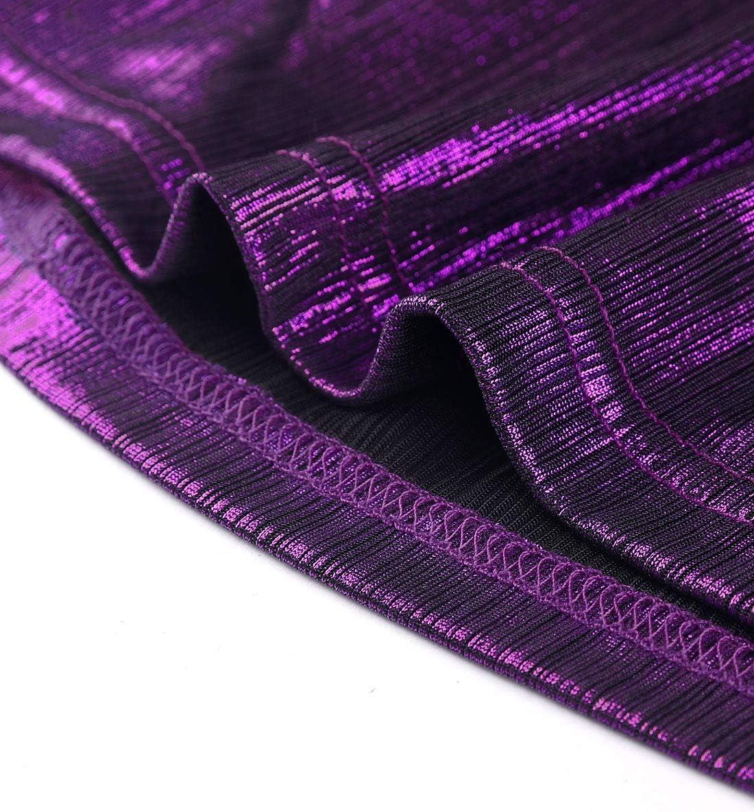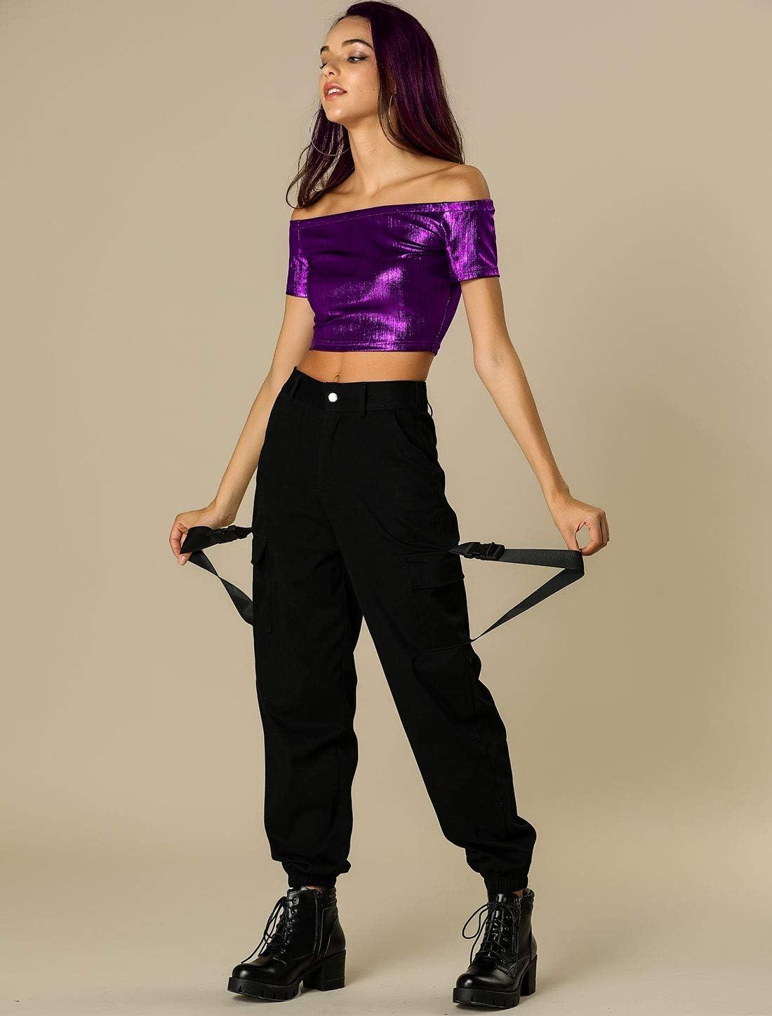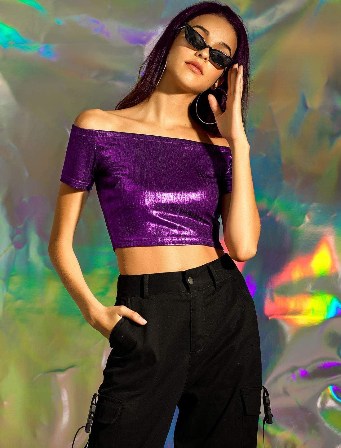 Allegra K Women’s Halloween Off Shoulder Party Club Slim Fit Shiny Metallic Crop Top(Purple)