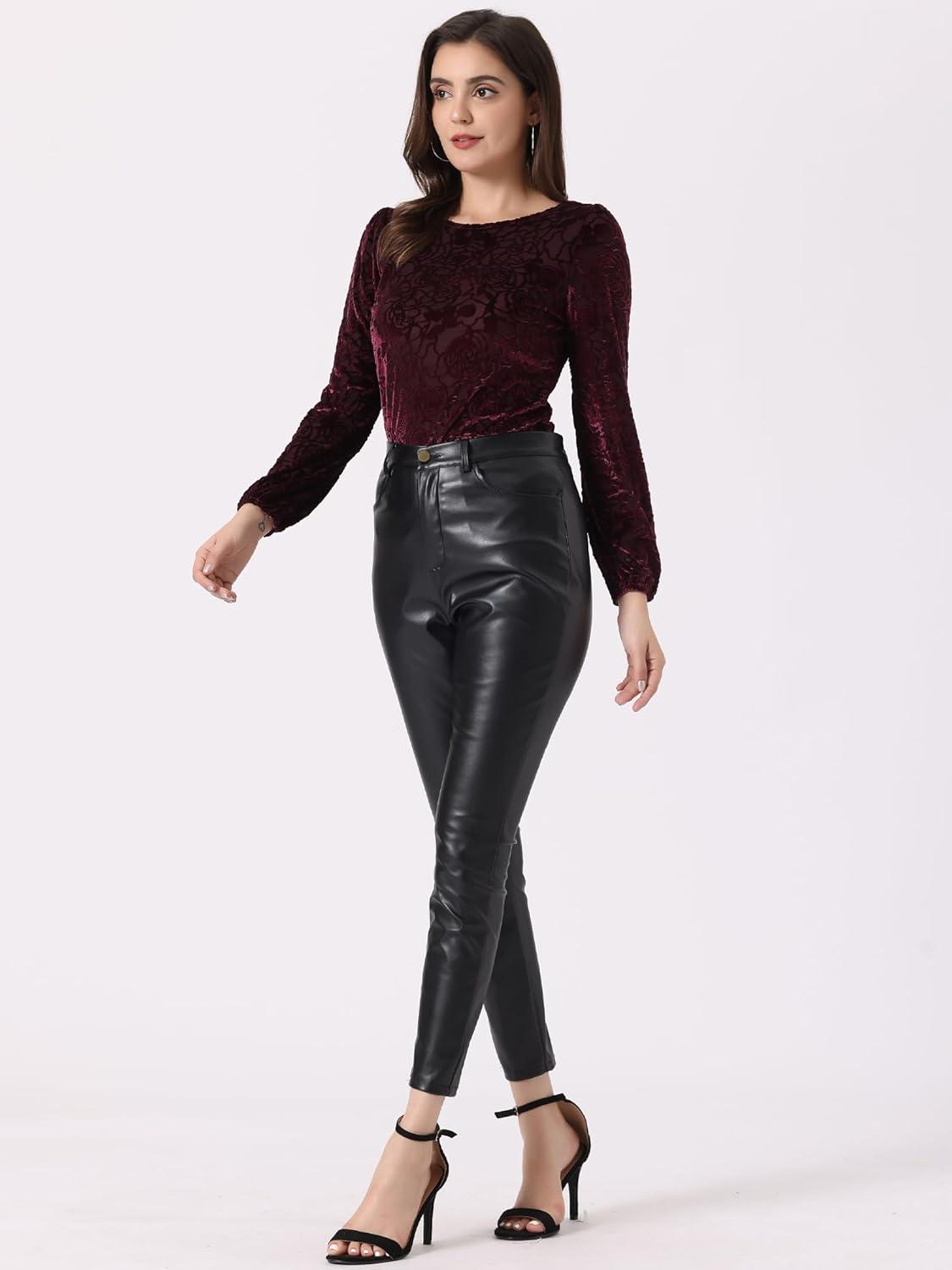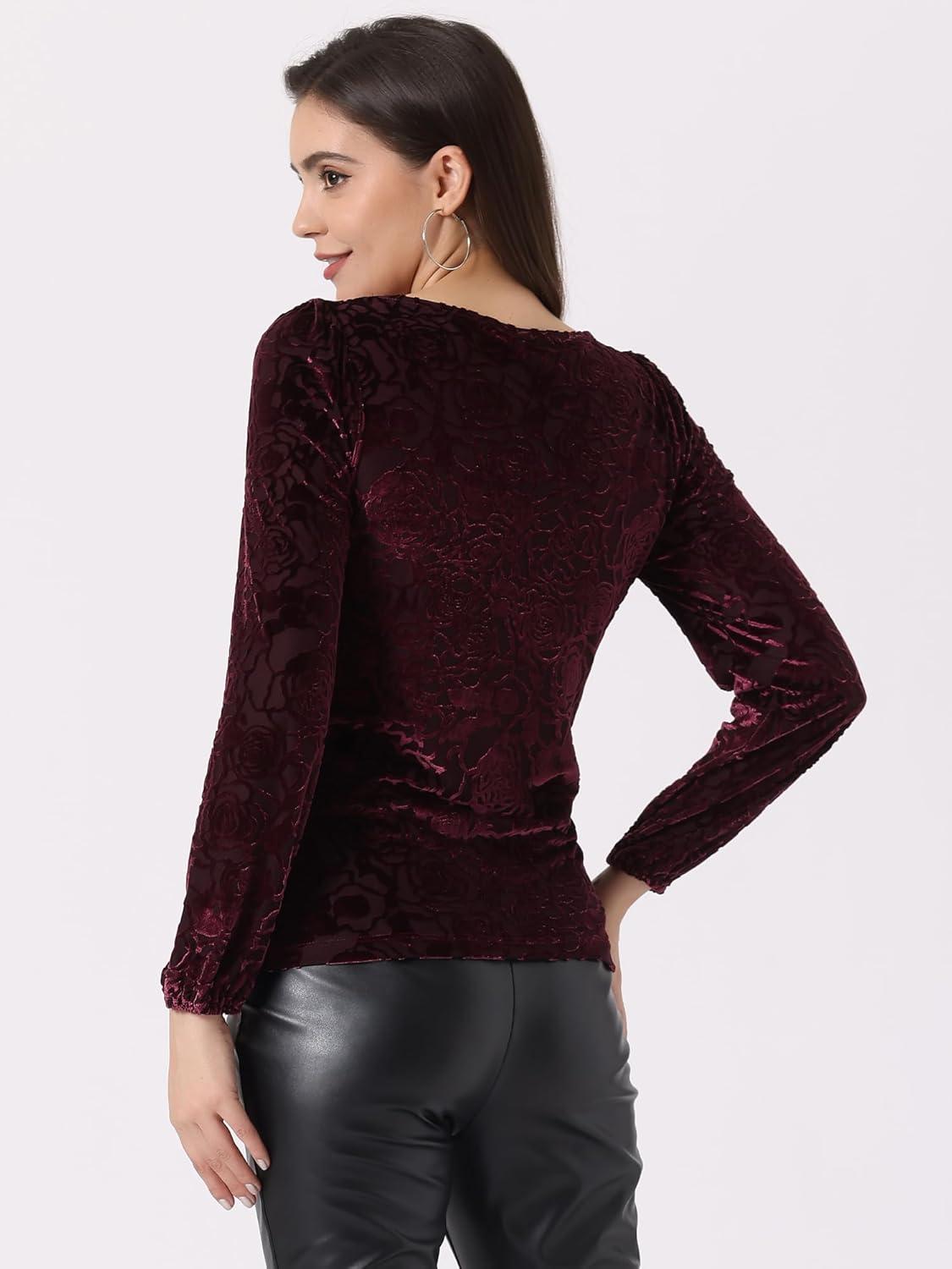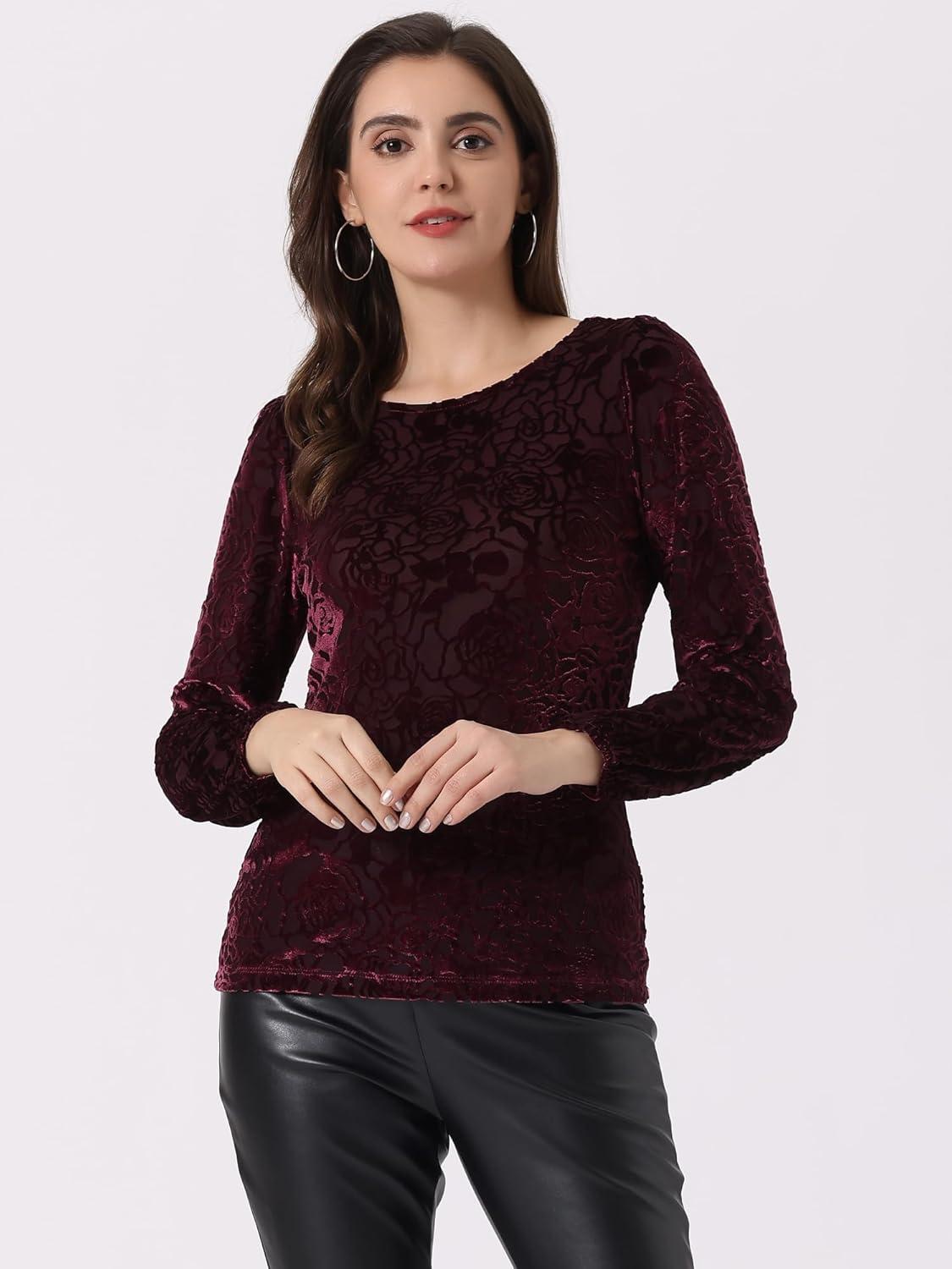 imageAllegra K Womens Halloween Velvet Top Semi Sheer BurnOut Long Sleeve Printed TopBurgundy