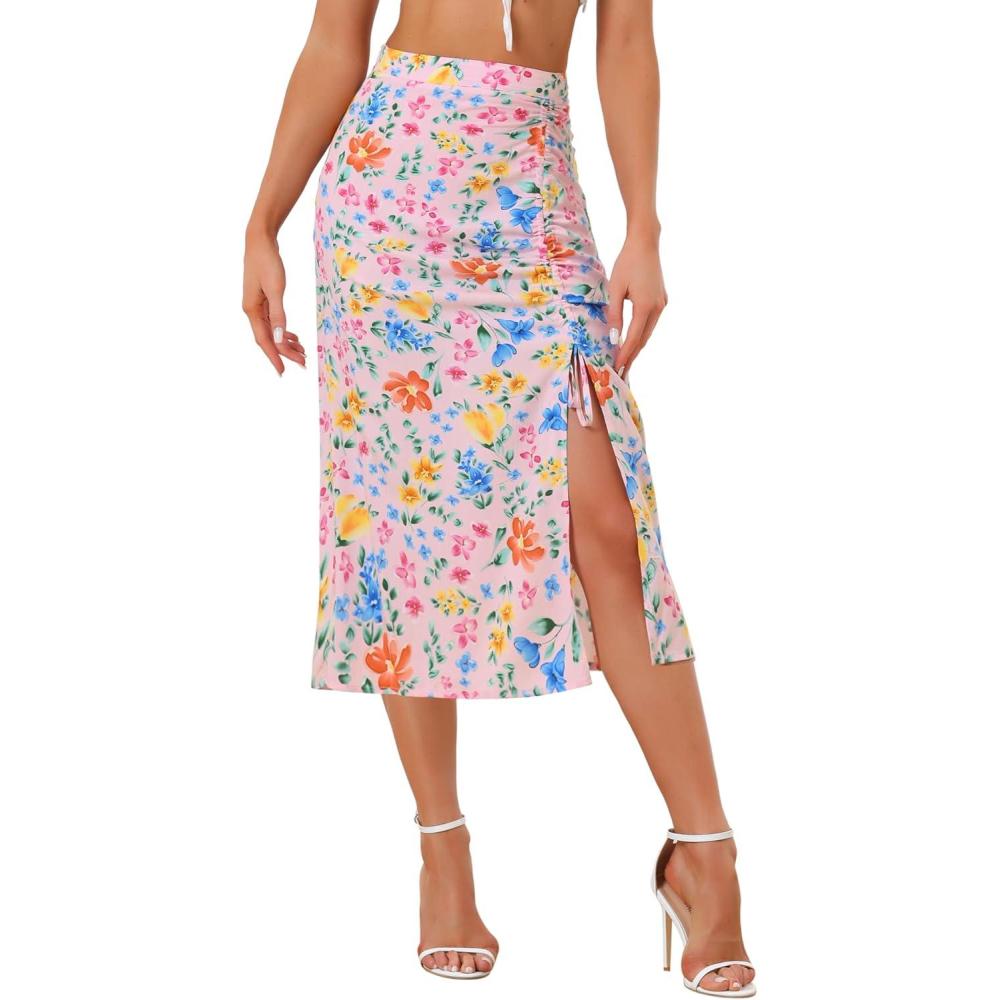imageAllegra K Womens Hawaiian Skirts Summer Beach Ruched Split Thigh Tropical SkirtPink