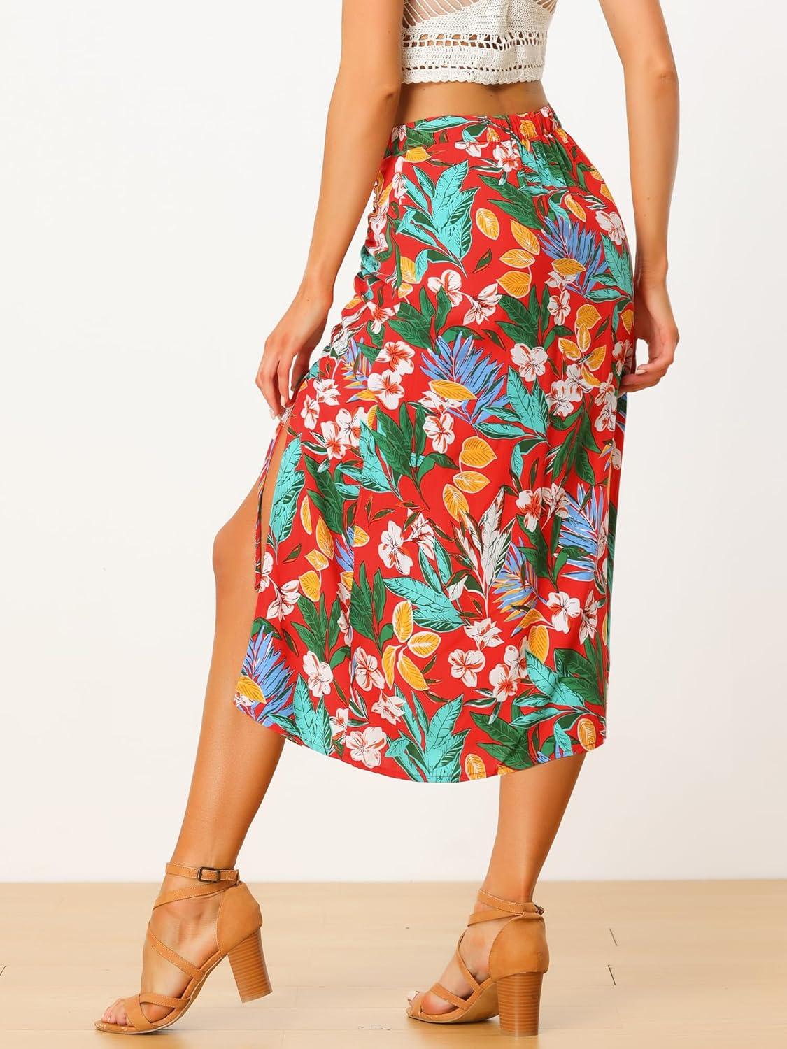 Allegra K Women’s Hawaiian Skirts Summer Beach Ruched Split Thigh Tropical Skirt(Red)