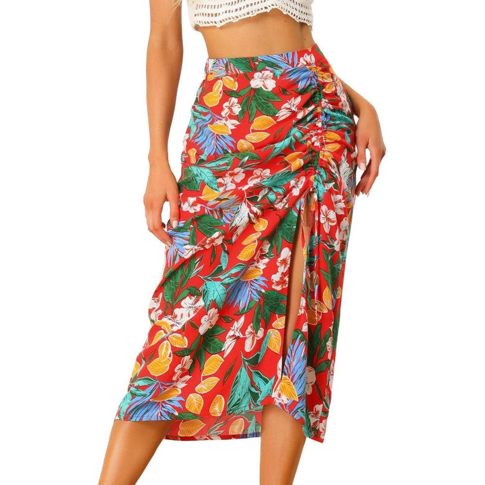 imageAllegra K Womens Hawaiian Skirts Summer Beach Ruched Split Thigh Tropical SkirtRed