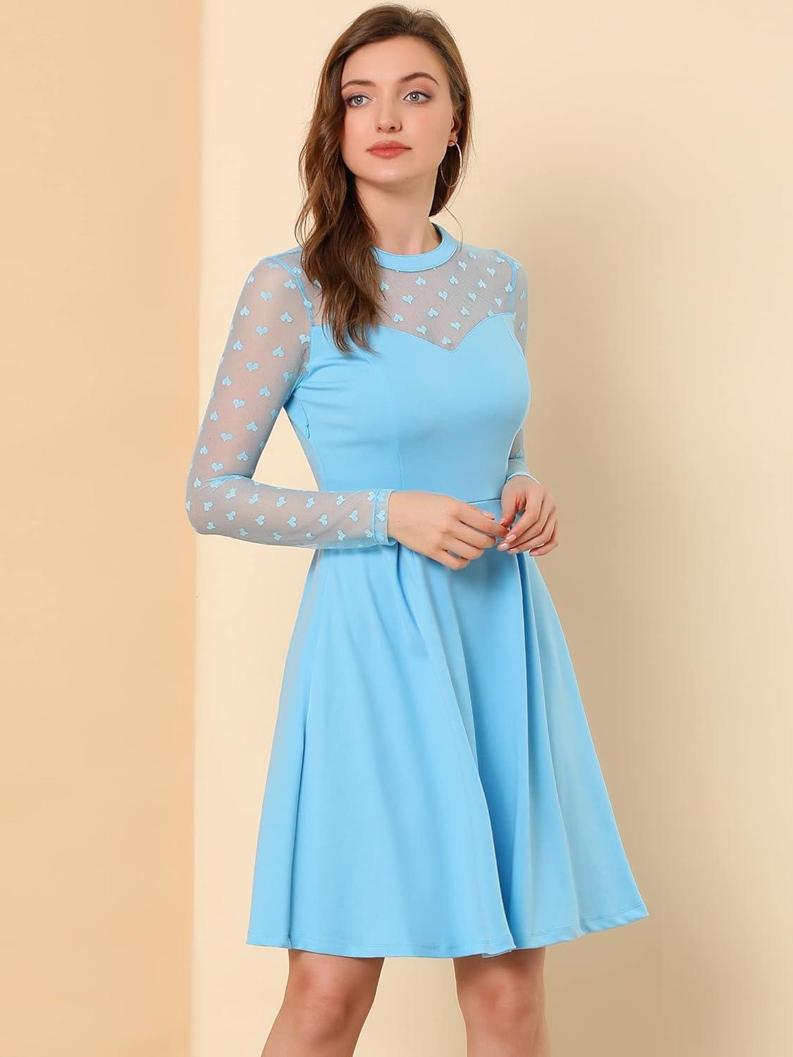 Allegra K Women’s Heart Mesh Sheer Long Sleeve Gothic Cocktail Wedding Guest Skater Party Short Dress(Light Blue)