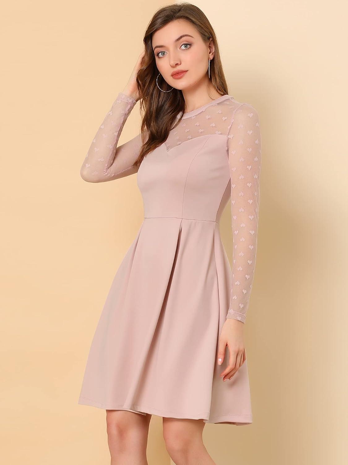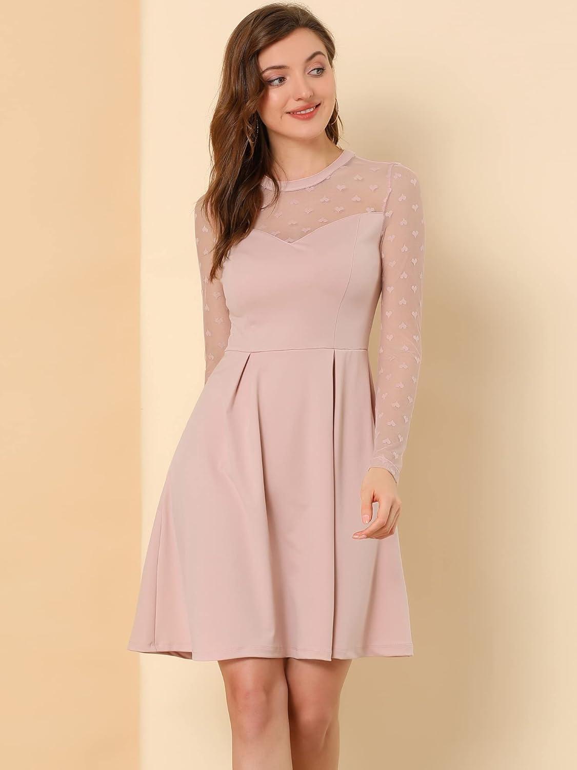 Allegra K Women’s Heart Mesh Sheer Long Sleeve Gothic Cocktail Wedding Guest Skater Party Short Dress(Pink)