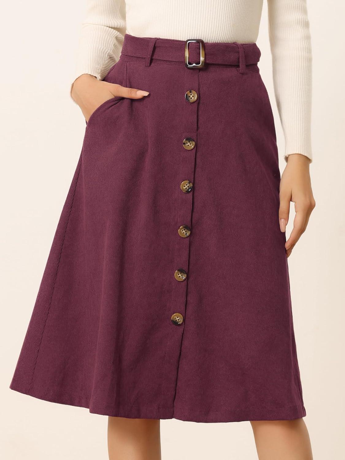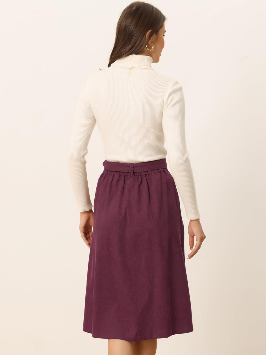 Allegra K Womens High Waist Button Front A-Line Belted Corduroy Midi Skirt(Burgundy)