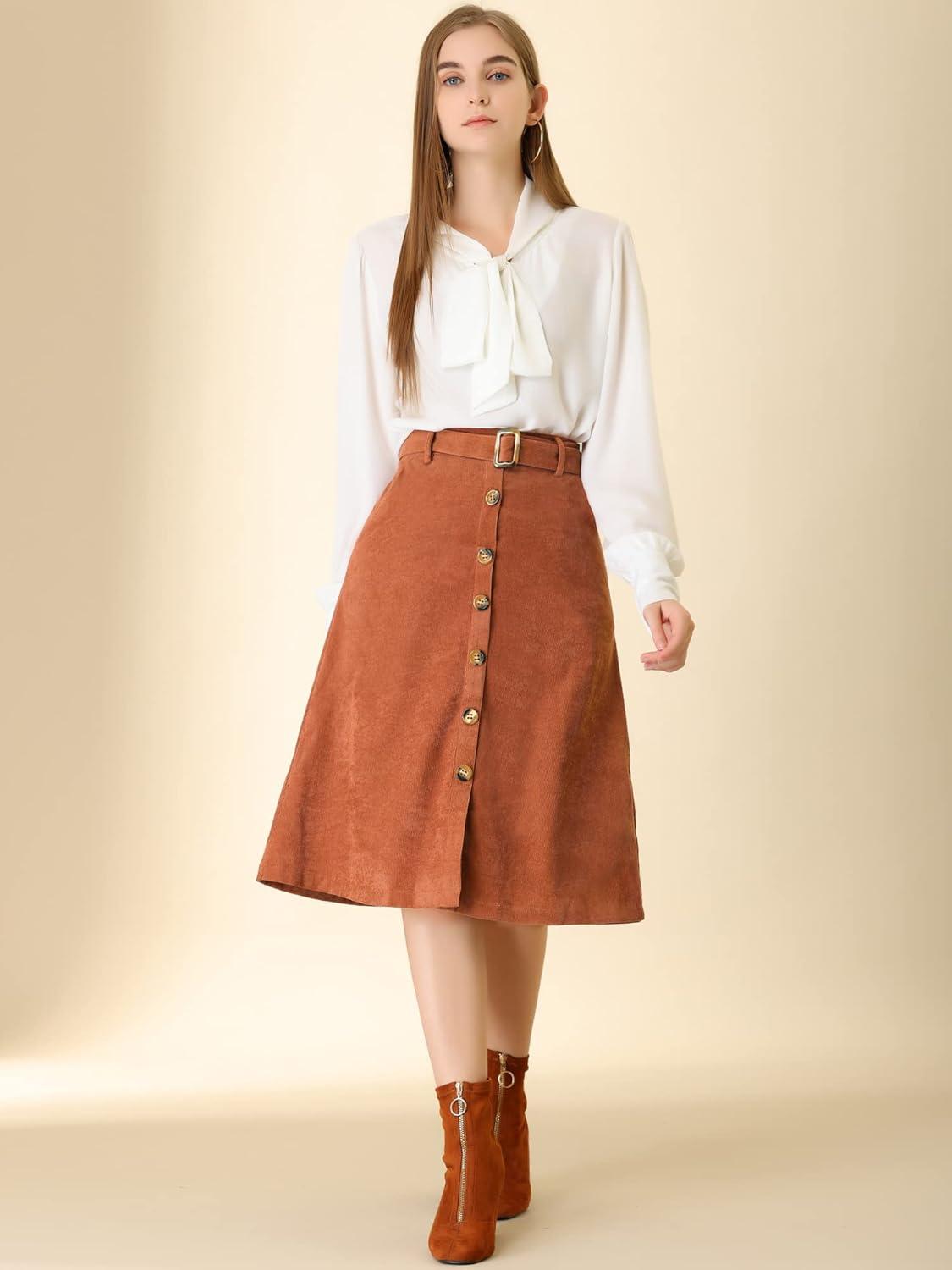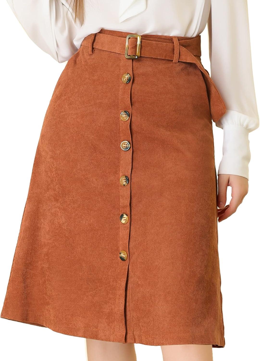 Allegra K Womens High Waist Button Front A-Line Belted Corduroy Midi Skirt(Coffee)
