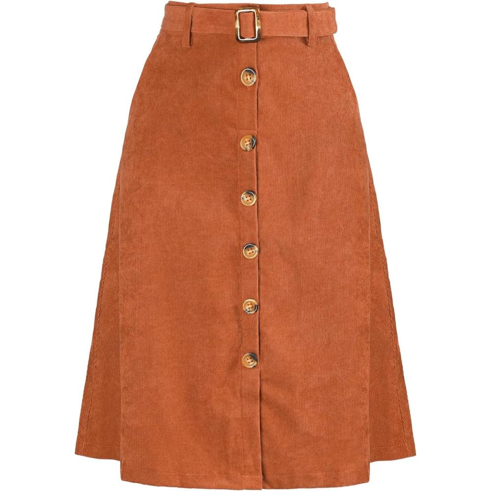 Allegra K Womens High Waist Button Front A-Line Belted Corduroy Midi Skirt(Caramel)