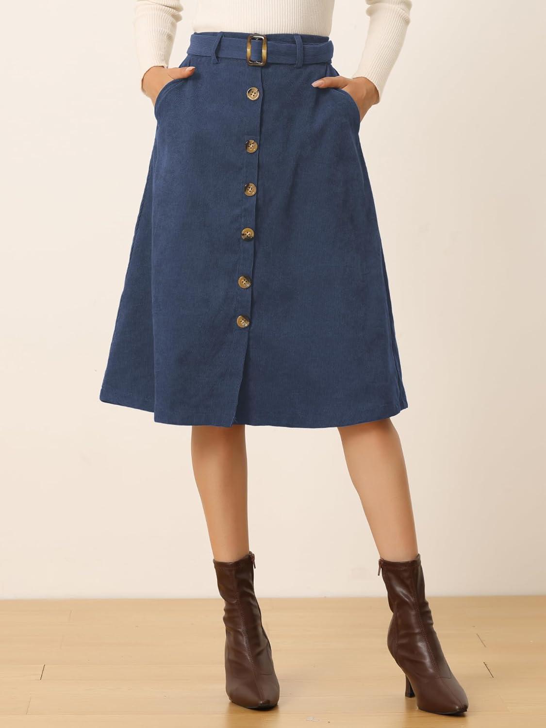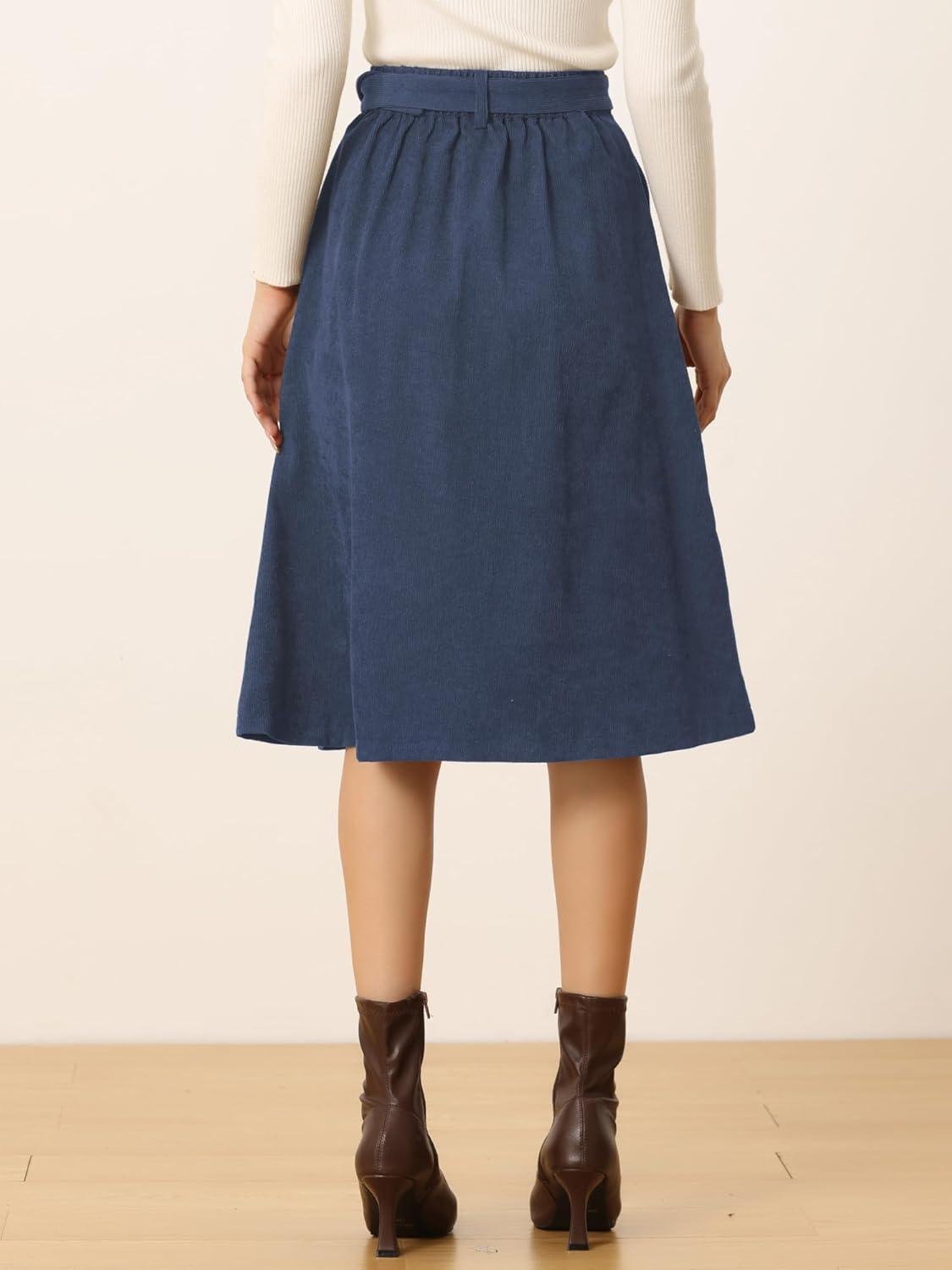 Allegra K Womens High Waist Button Front A-Line Belted Corduroy Midi Skirt(Dark Blue)